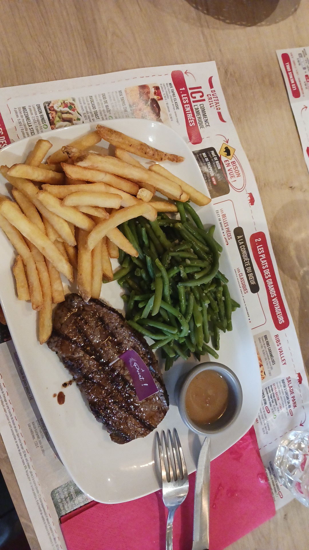 Accueil très chaleureux. Mais viande décongelée et de médiocre qualité pour une enseigne comme Buffalo Grill. Les frites sont bonnes mais les PDT au four sont à éviter... aucun intérêt : 1 grosse PDT cuite à la vapeur, découpée en 2, sans assaisonnement. Et pour les enfants, une aire de jeux payante...
