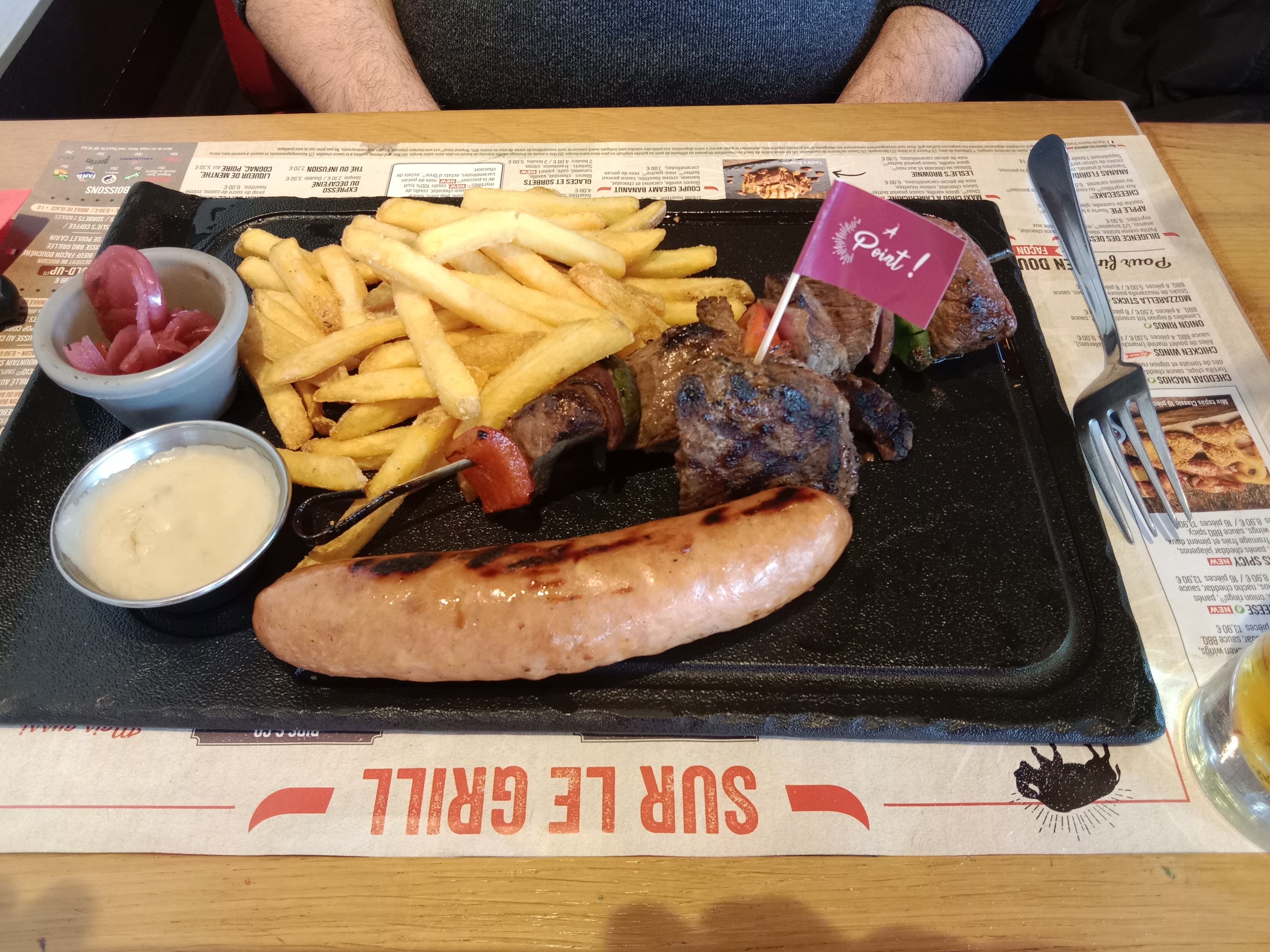 Arrivée seule à 14h. Accueil immédiat et agréable. Serveuse Elodie très chaleureuse. Brochette de bœuf et frites. Excellent ! C'est la première fois que j'y allais et j'y retournerai avec plaisir très bientôt.
