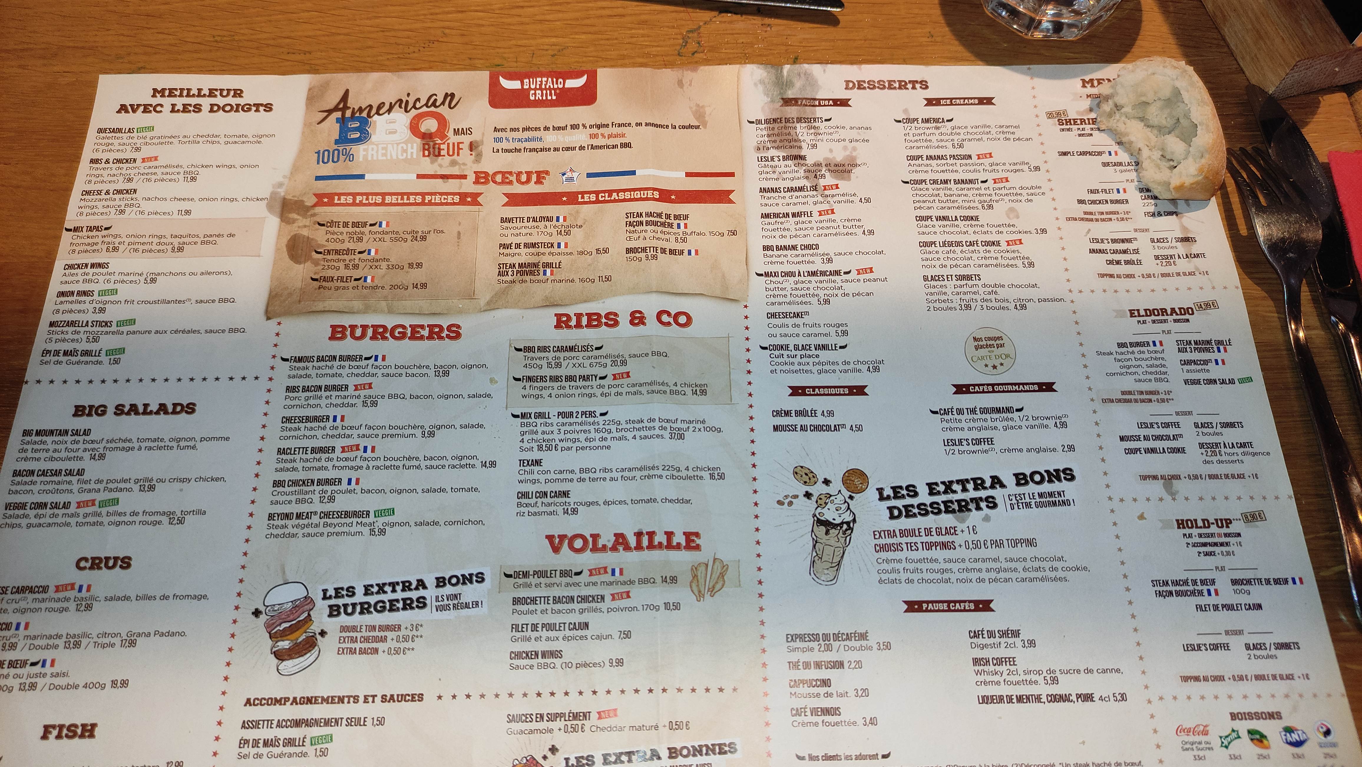 Je suis allée manger avec mes parents et mon mari dans ce buffalo, et comme toujours je trouves ça excellent. Nous avons été bien accueilli par le serveur Mike. Nous avons pris un petit apero avec la salade de bienvenue qui fait toujours plaisir. Pour ma part j'ai testé le cheesburger avec ses frites, il est très bon. !! Mon mari lui à testé la planche du trappeur dedans il y avait du bison et il a trouvé la viande très tendre.!! Je vous le recommande. !! En dessert j'ai pris le cheescake avec son coulis fruit de la passion qui est excellent. !!