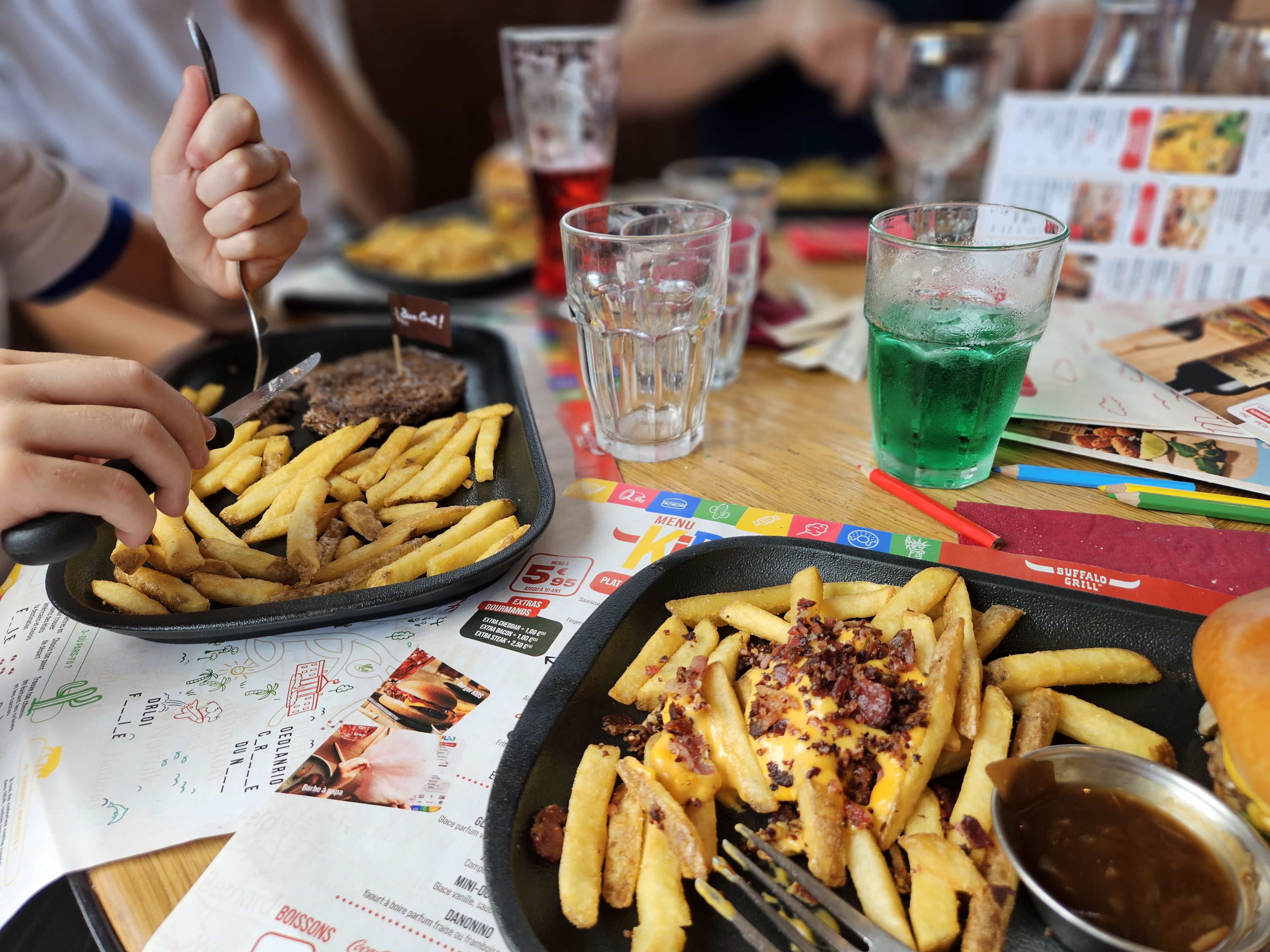Je me faisais un plaisir de manger un burger dans cet endroit propre et bien décoré. 45 minutes d'attente pour être servi, pas de petits pains (car en cuisson). Burger froid, tranches de cheddar (morceaux carrés) pas fondues, pas de sauce, donc sandwich super sec. Immangeable. Bref, chez Mc Do, c'est meilleur ! Et moins cher. Installés à deux tables des jeux d'enfants et des wc (portes ouvertes) : bruit du séche mains, claquement de portes et cris des enfants : infernal. Les autres Buffalo : tout est au premier étage, c'est plus cosy. Certes, la configuration est ainsi, mais si vous voulez vraiment y manger, installez-vous à gauche de la caisse.
