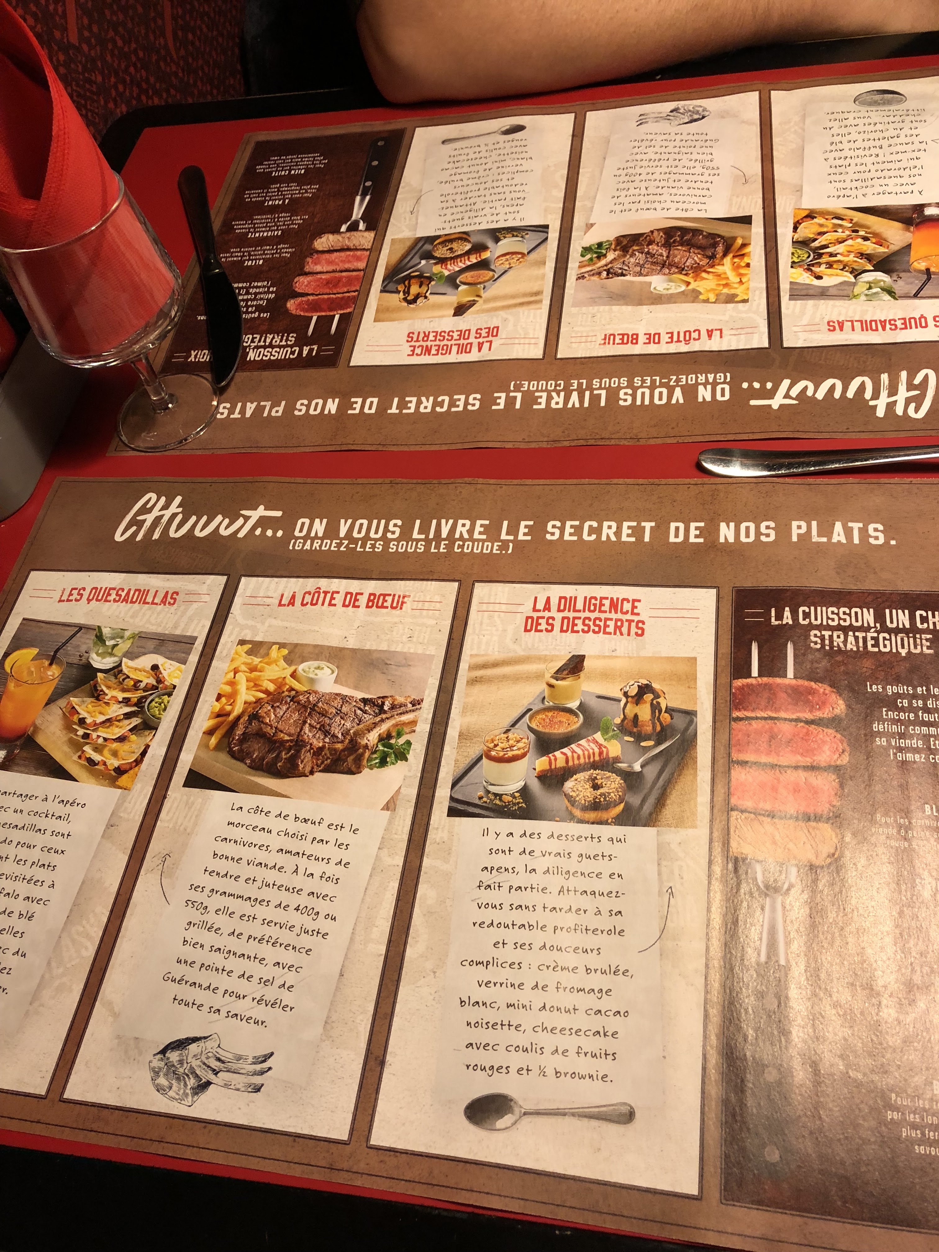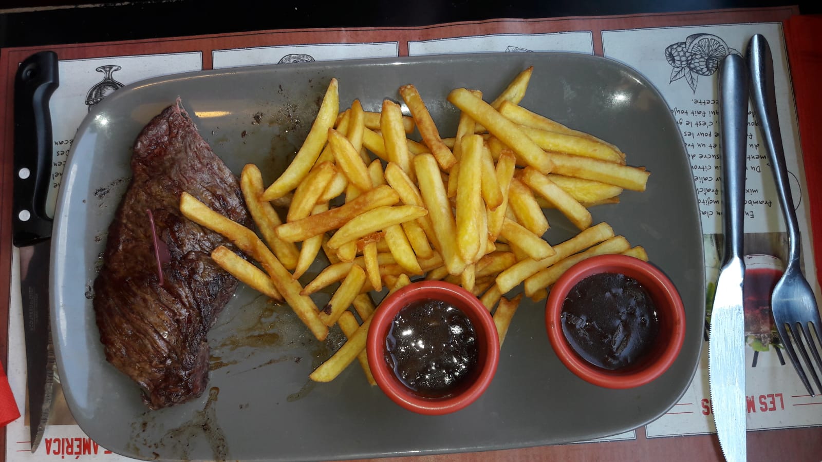 Bon d'après la serveuse il faut déposer un avis... Vous allez pas êtes déçu... Sachant que ça faisait un moment qu'on avais pas été dans cette enseigne on s'est dit avec ma moitié allez on tente. Alors une fois placé sur votre table avec la déco du luminaire qui tombe à moitié on vous donne un vieux bout de papier avec un QR code pour vous débrouiller tout seul, super tu viens au resto pour un moment privilégié avec madame tu te retrouve la tête dans le smartphone à comprendre comment ça marche... Oui parce que la serveuse n'as pas le temps du coup y'a plus rien à faire... La salade offerte est pitoyable, madame un peu plus chanceuse elle avais des haricots rouge dedans moi que dalle... Du coup on attaque la salade alors qu'on a même pas encore choisi l'apéritif, une fois compris le système on commande, du coup ça arrive en cuisine moi qui commande une bière pour accompagner le plat principal, et bien on me l'apporte à l'apéro alors que j était toujours au cocktail, les plats arrivent avec littéralement 13 frittes (oui j'ai compté) pour accompagner une viande sèche, tiède et de qualité moyenne, des couteaux qui ne coupent pas (celui de madame pour le coup) enfin tout va bien, seul le désert nous a satisfait (bon et copieux). Bref 85€ sans entrée et sans vin pour 2 personnes de cette qualité non merci, je passe sur le ambiance et le nombre de client présent qui reflète l'état général (plus de gens en pause dehors au restau à côté que de client qui mange à celui ci....) Bref portez vous sur le restaurant l'usine je côté qui est bien supérieur en tout points pour le même prix ou poussez chez l'oncle Scott de coulommiers pour vraiment manger de la viande ! Je déconseille fortement !!!