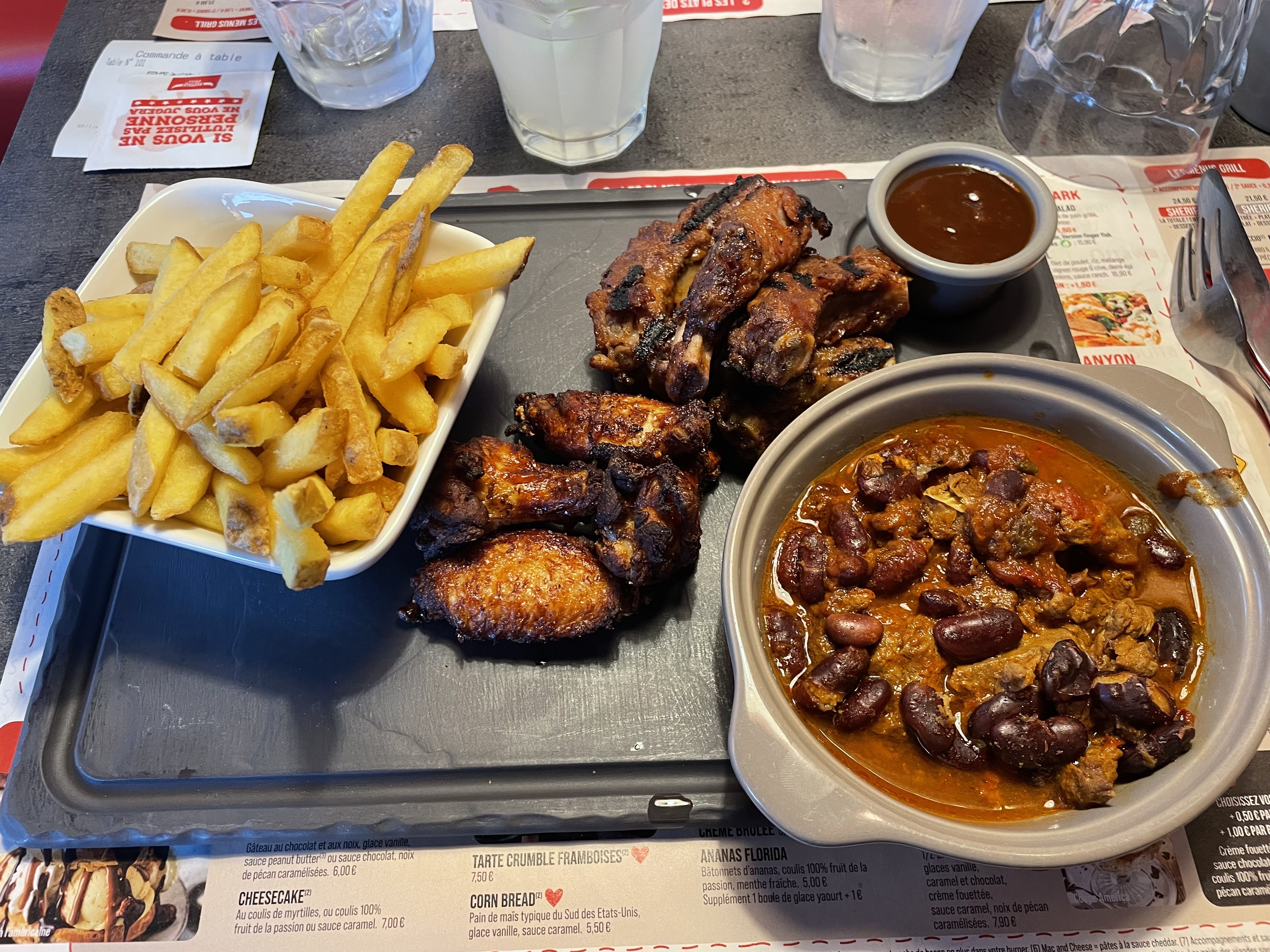 Chili servi froid mais réchauffé à la demande. Nous étions en mode détente mais la serveuse nous a un peu trop pressé. Plus de salade d'accueil, dommage. Et les cadeaux avec le menu enfants pas donné, obligé de réclamer. On a toutefois passé un bon moment et bien mangé