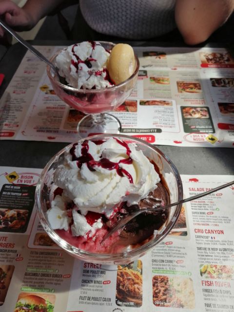Dommage de devoir redemander de l'eau et du pain, Nos plats préférés n'existe plus snif Pavé de bison, autruche, bœuf Salade chèvre chaud miel Banana Split