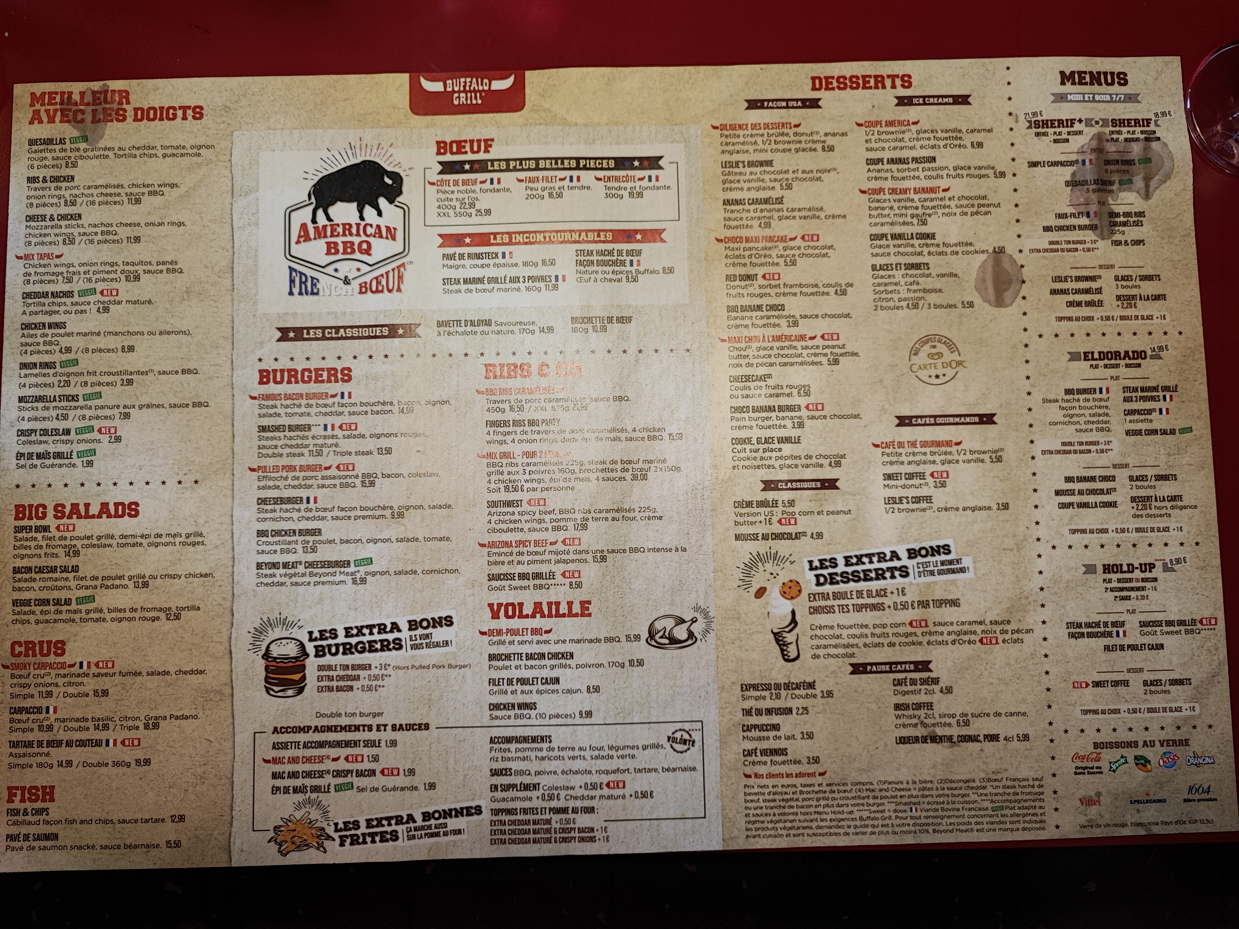 Cela reste du Buffalo Grill, mais l'ambiance légèrement feutré et les canapés rouges sont indémodables. La qualité culinaire reste correcte. Et les services sont bons. Service rapide.