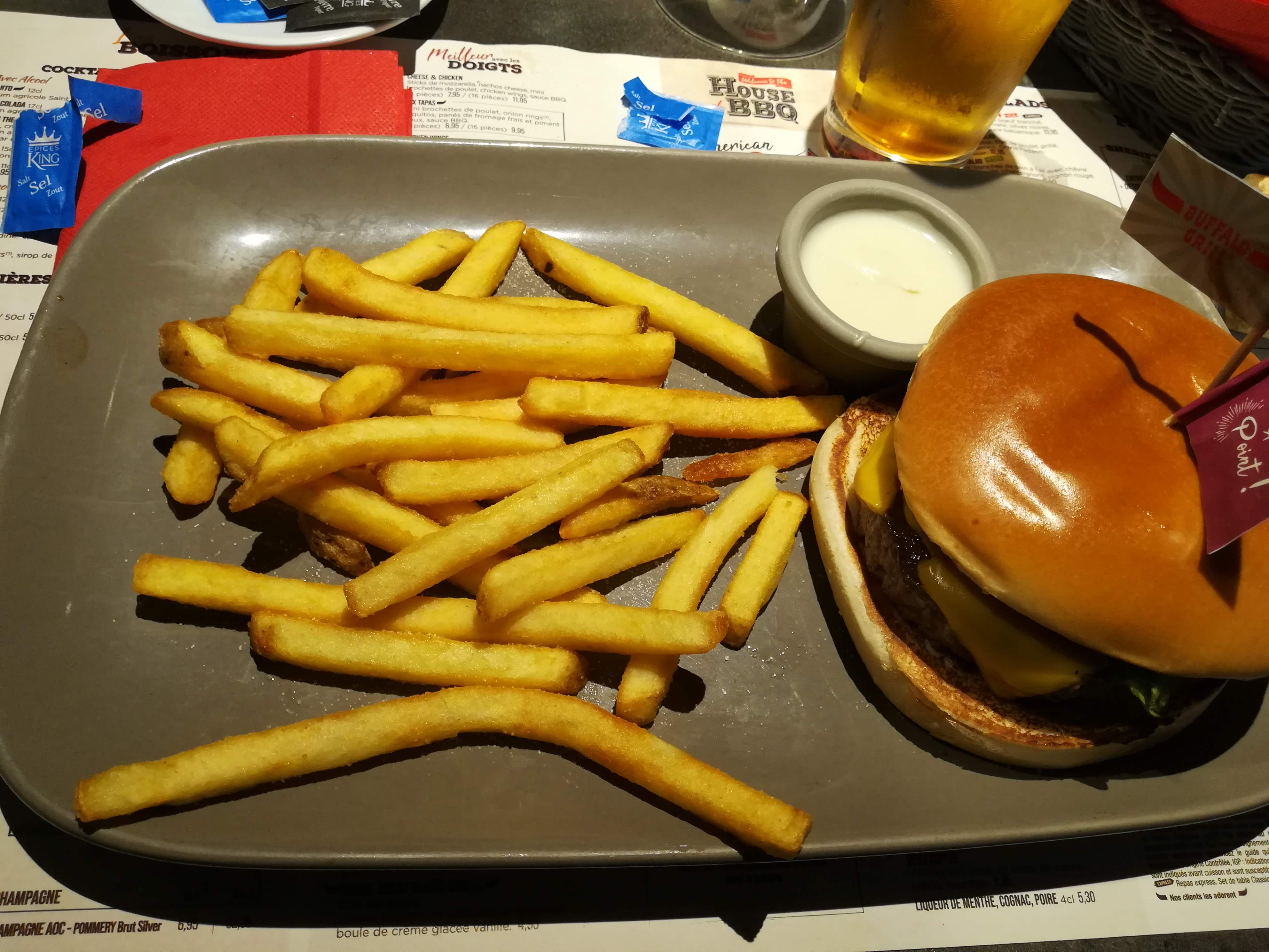Mon Burger était conforme à la description... et bon. Le pavé de saumon a certainement été saisi sur une grille ayant servi à griller de la viande, ce qui a provoqué un mélange de saveur Saumon/viande assez désagréable. La sauce béarnaise servie avec le saumon devait avoir été mise en pot en début de service, ayant été servi à 14h15, la béarnaise a séché en surface. J'ai ajouté une étoile pour le serveur très prévenant et avenant n'ayant pas hésité à a nous offrir le café...