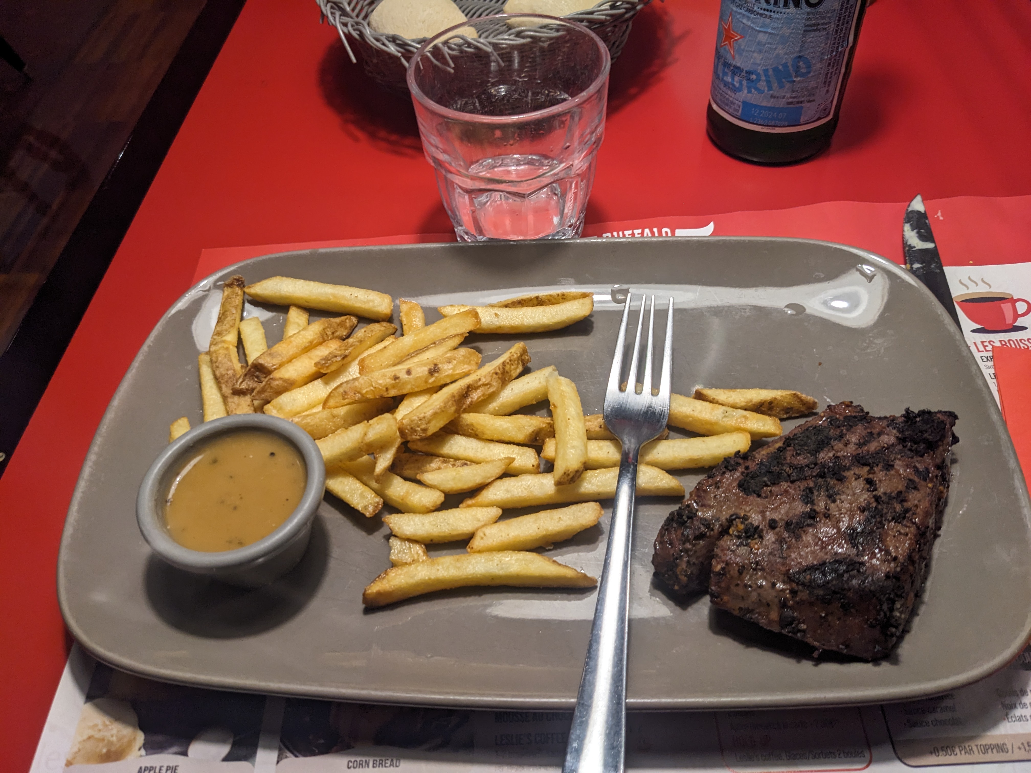 La qualité est toujours au rendez-vous avec cependant quelques différences quant aux proportions servies (salade de bienvenue et portions de frites de taille réduite). La climatisation nécessite le port d'un vêtement chaud. Le pavé de rumsteck est délicieux à condition qu'il ne soit pas trop grillé pour préserver sa saveur
