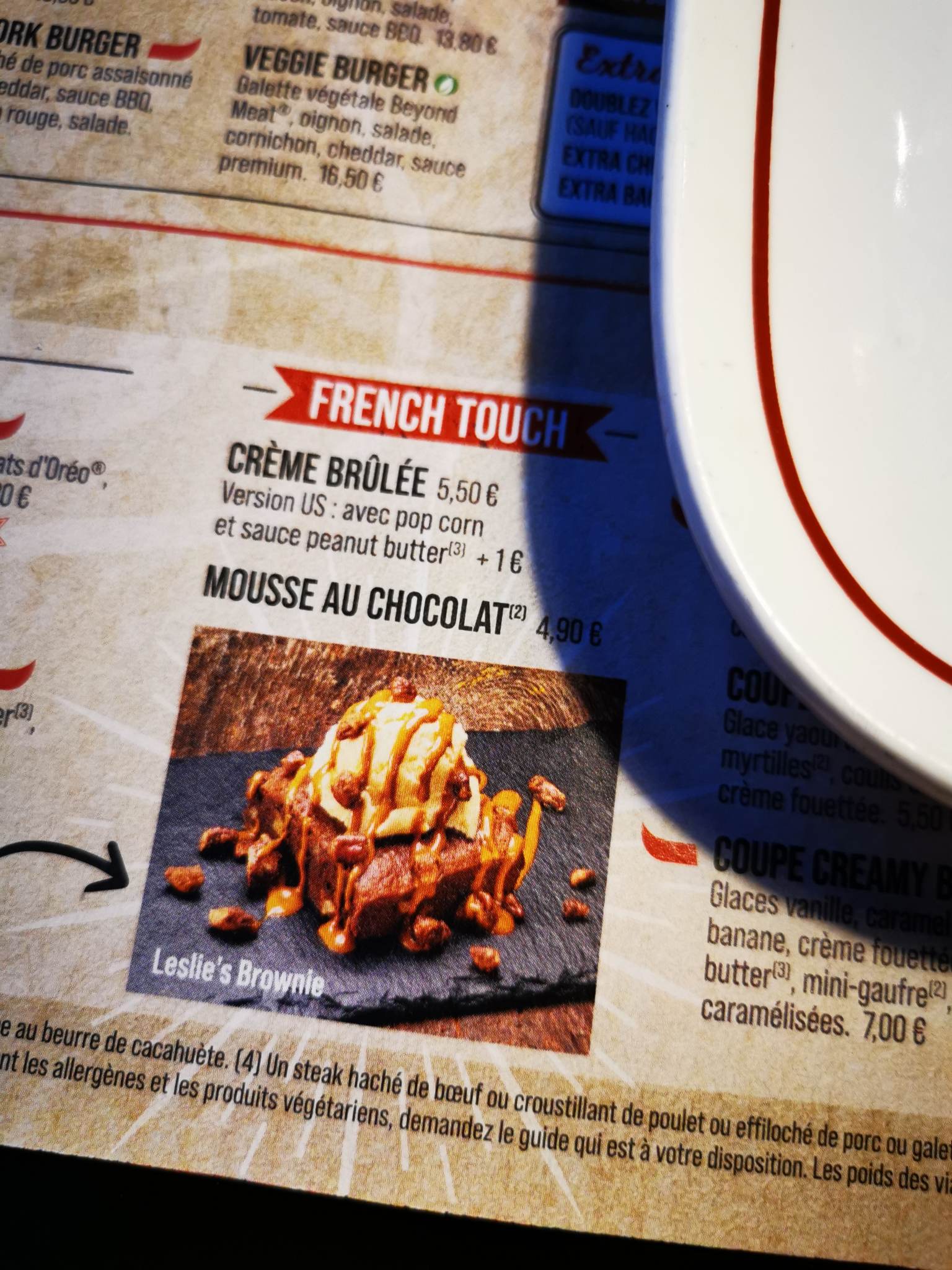 Très déçu avec ma chéri de notre passage, le 2/04/2023 vers 19h30, De la pub partout dans le restaurant du burger Raclette, (affiche/télé/ menu sur le set de table avec la mention New) pour qu'au final ou nous disent que la carte change le lendemain et qu'il n'est plus disponible. ( Du coup enlever les pubs peut être ??? ) Et pour le dessert, je vous laisserais voir les photos, ma chérie a commandé le Leslie's Brownie, avec noix de pécan caramélisé, pour qu'au final on se retrouve avec du biscuit Oréo émietté dessus, ce qui n'est absolument pas la même chose !!! ( Je peux tout à fait comprendre qu'il y en ai plu, mais dans c'est cas là ils faudrait être prévenue ce qui n'a pas été le cas ) Je le signale à la Dame qui nous encaisse, elle me dit qu'il y en a plus et c'est tout, même pas de geste commerciale ( Je demande pas le repas offert, mais rien que le faite de proposé un café - qui vous coute pas grand chose - aurais été appréciable ) Sinon le repas étais bon ( sans plus ) et un peu cher. Bref très déçu, nous ne reviendrons plus !