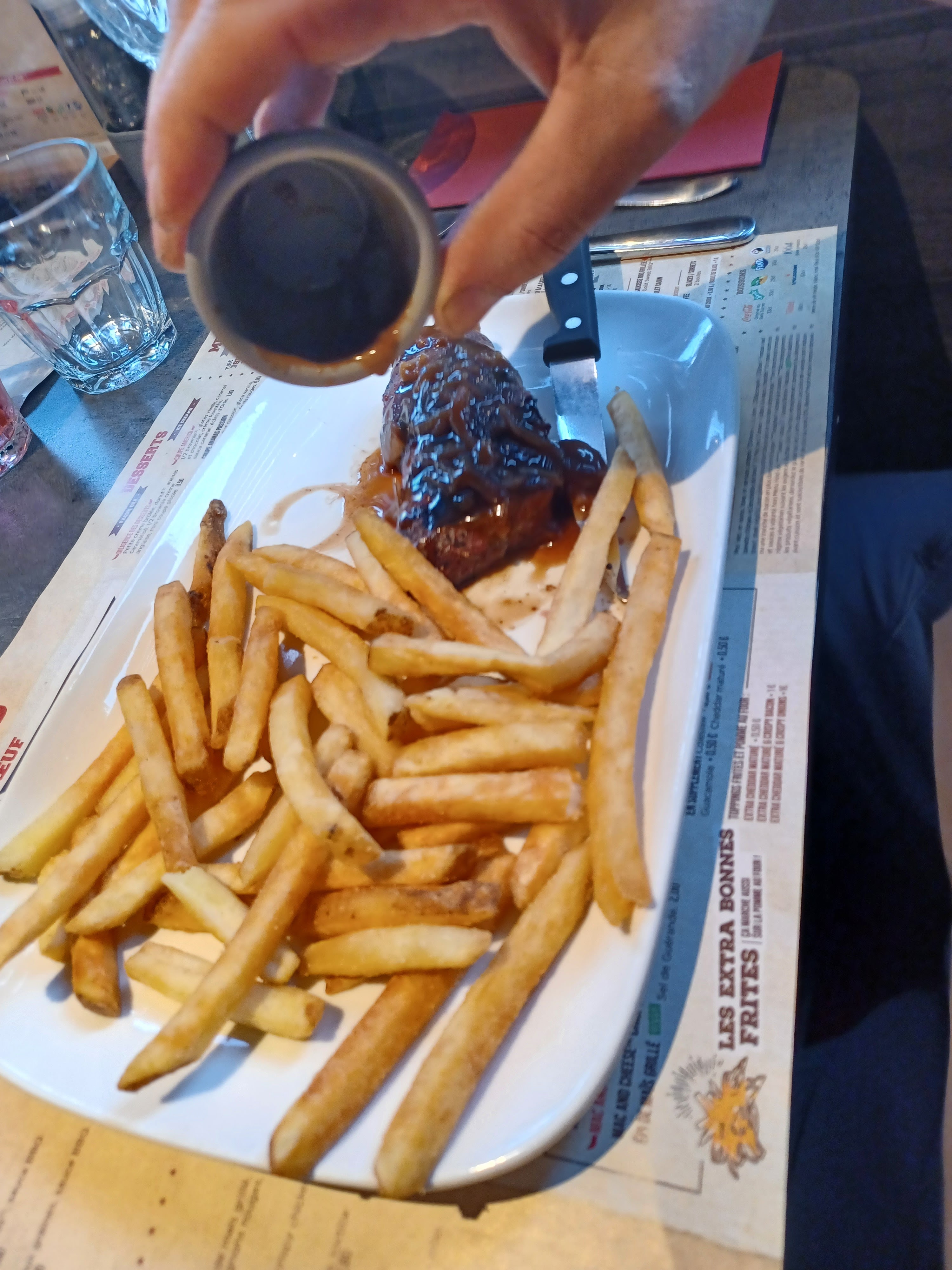 Soirée Halloween bien sympa ! Une mise dans l'ambiance bien équilibrée. Serveur sympa ! Steak tendre et cuit comme il faut. Je trouve aussi qu'il y a moins de frites qu'avant. Nous avions posé la question la fois d'avant sur le pourquoi, et la réponse était que les gens, souvent, ne finissaient pas et qu'il y avait du gaspillage. Et franchement, là, c'était les bonnes quantités. Les adultes, nous avons finit nos assiettes sans avoir mal au ventre, mais en étant bien rassasiés.