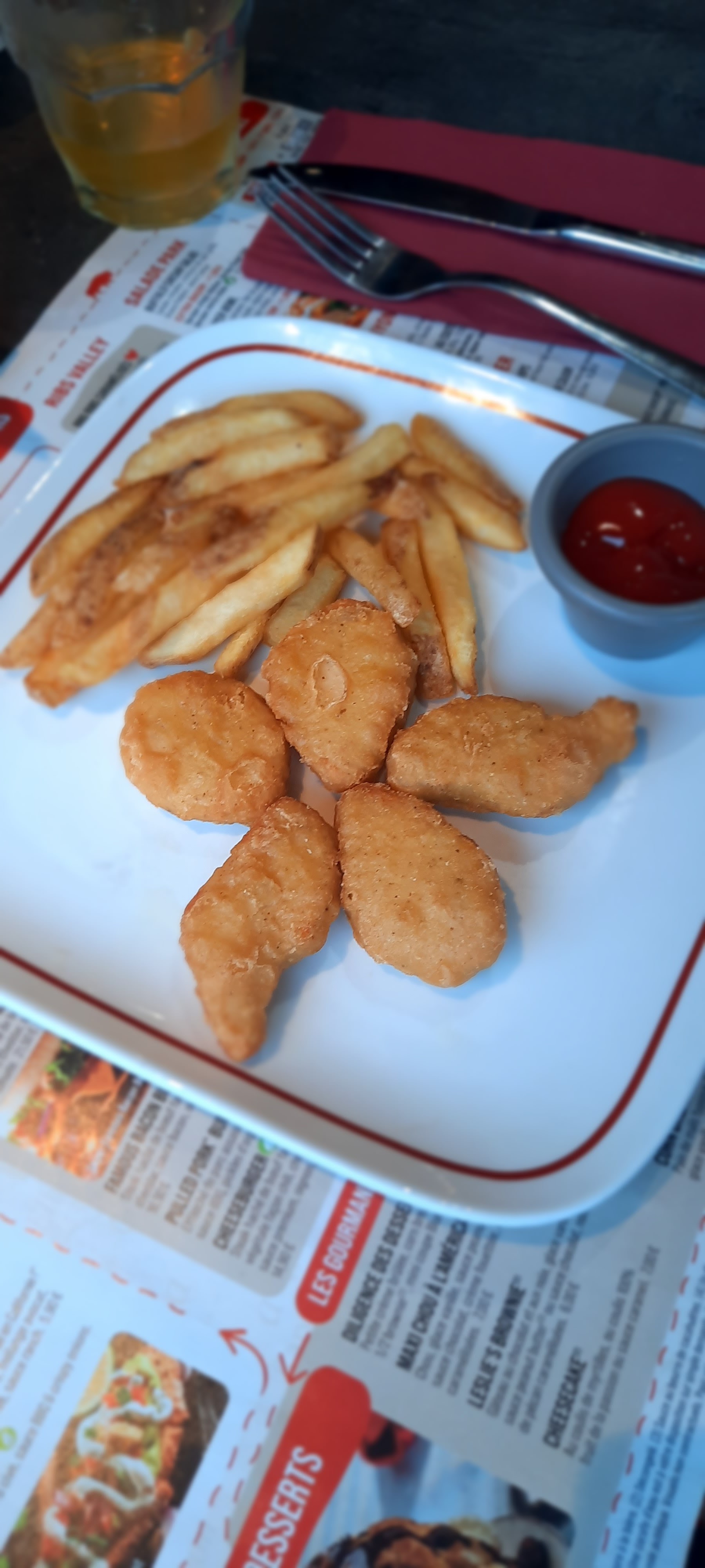 Nous sommes allez ce soir avec nos deux enfants (4 et 7ans) nous leurs prenons donc deux menus enfants (conseillé jusqu’à 10ans) mon grand prend un fish and chips et ce retrouve avec deux minuscules bâtonnet dans son assiette quand nous leurs demandons si il est possible d’en avoir deux ou trois en plus quitte à payer un petit supplément on nous réponds de prendre un autre menu enfant ou un menu adulte en plus! Nous avons donc pris un autre menu enfant en plus pour lui et lorsque son assiette arrive que deux bâtonnet de fish and chips et même pas de frite en plus en accompagnement !! Quitte à payer deux menus pour le même enfant autant lui mettre la totalité Quand nous avons évoqué le sujet au moment de payer on c’est bien rendu compte qu’elle n’en avait rien à faire !! Mieux vaut faire un peu plus de km et aller à landerneau qui est beaucoup plus accueillant et familial