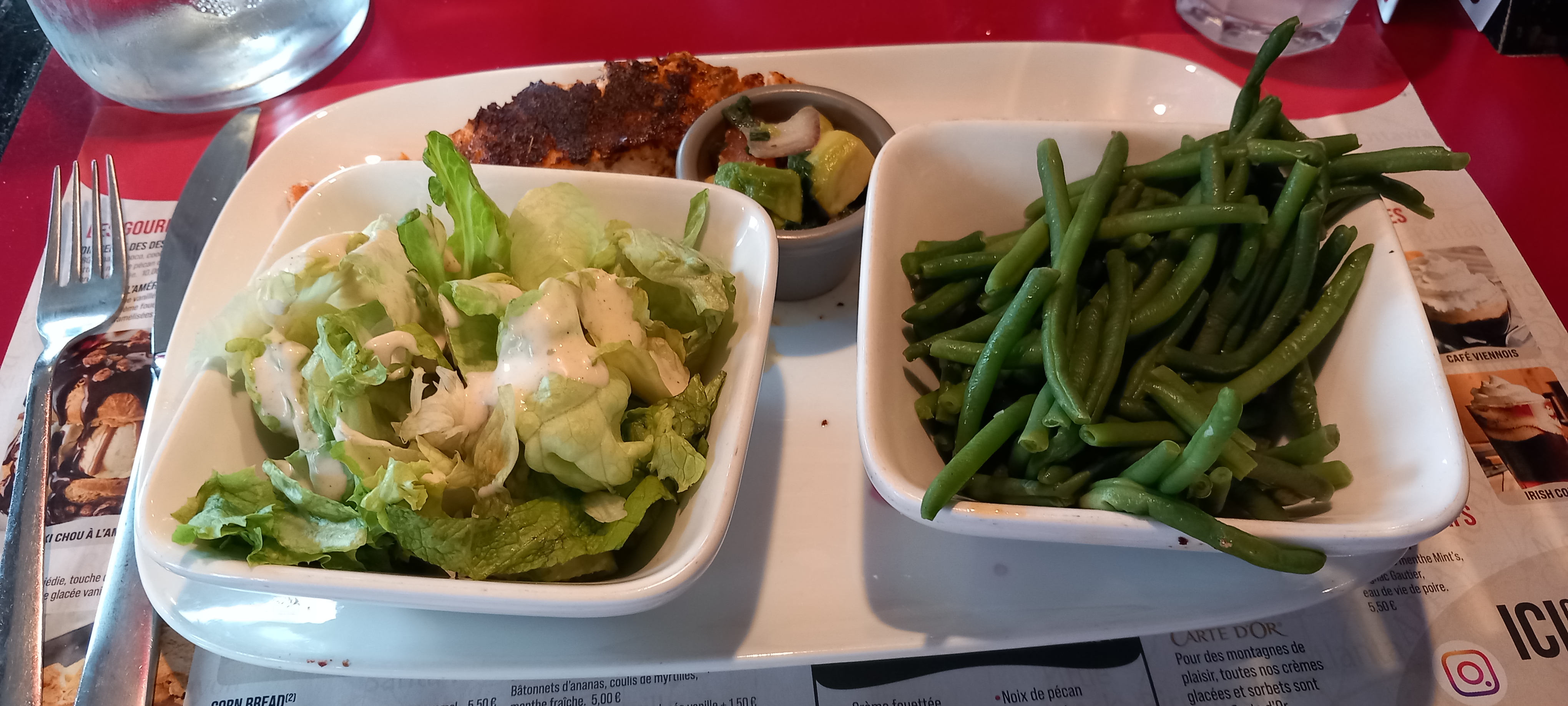 Apéritif Salade d’accueil Plats : salade, burger et tartare RAS ….. et entrecôte : pas la bonne cuisson et pleine de nerfs et gras ! N’ai pu en manger que la moitié ! Desserts : RAS Serveuse ( genouillère) sympa. ( Toilette à rénover et problème chasse d’eau femme)