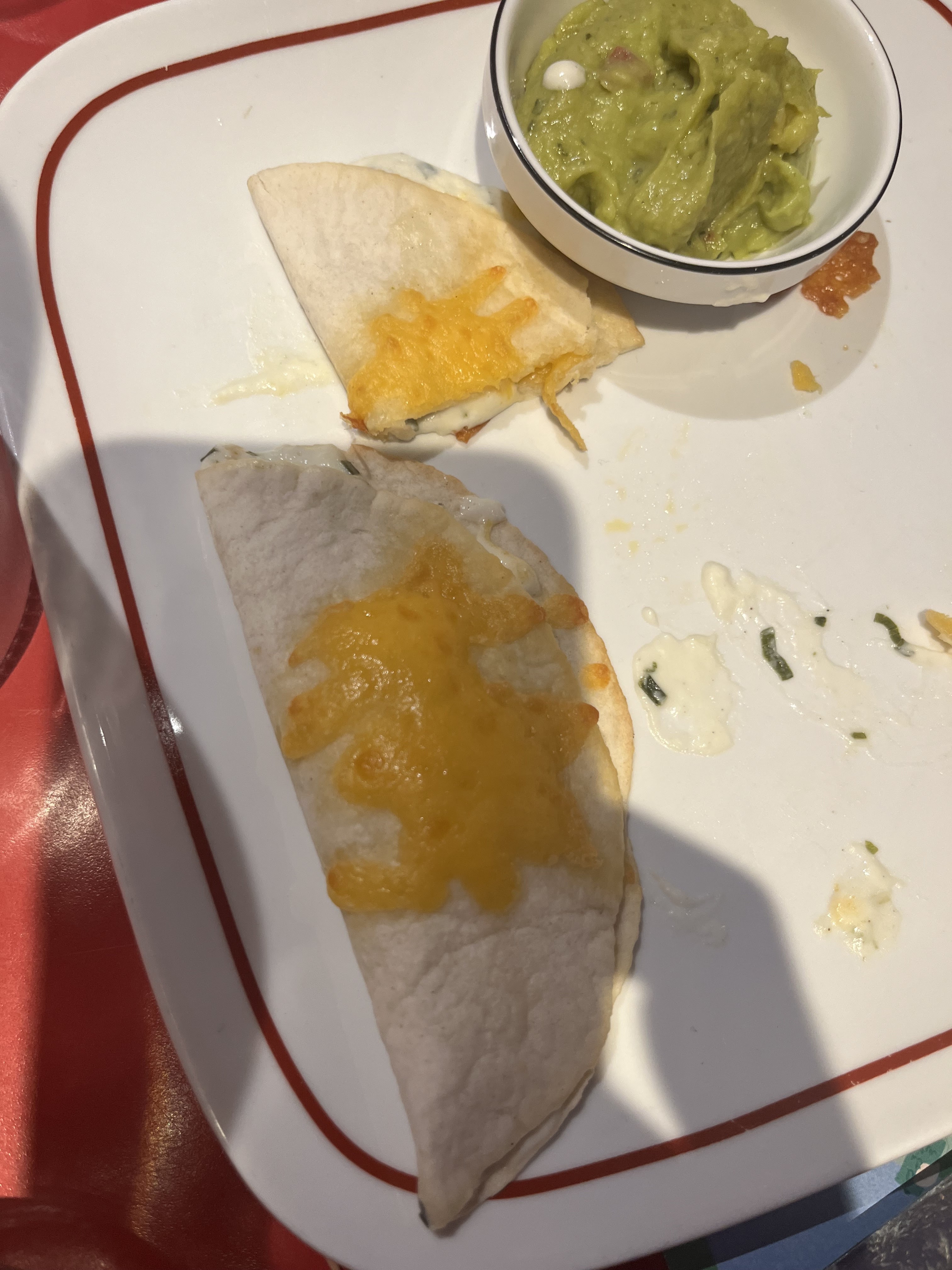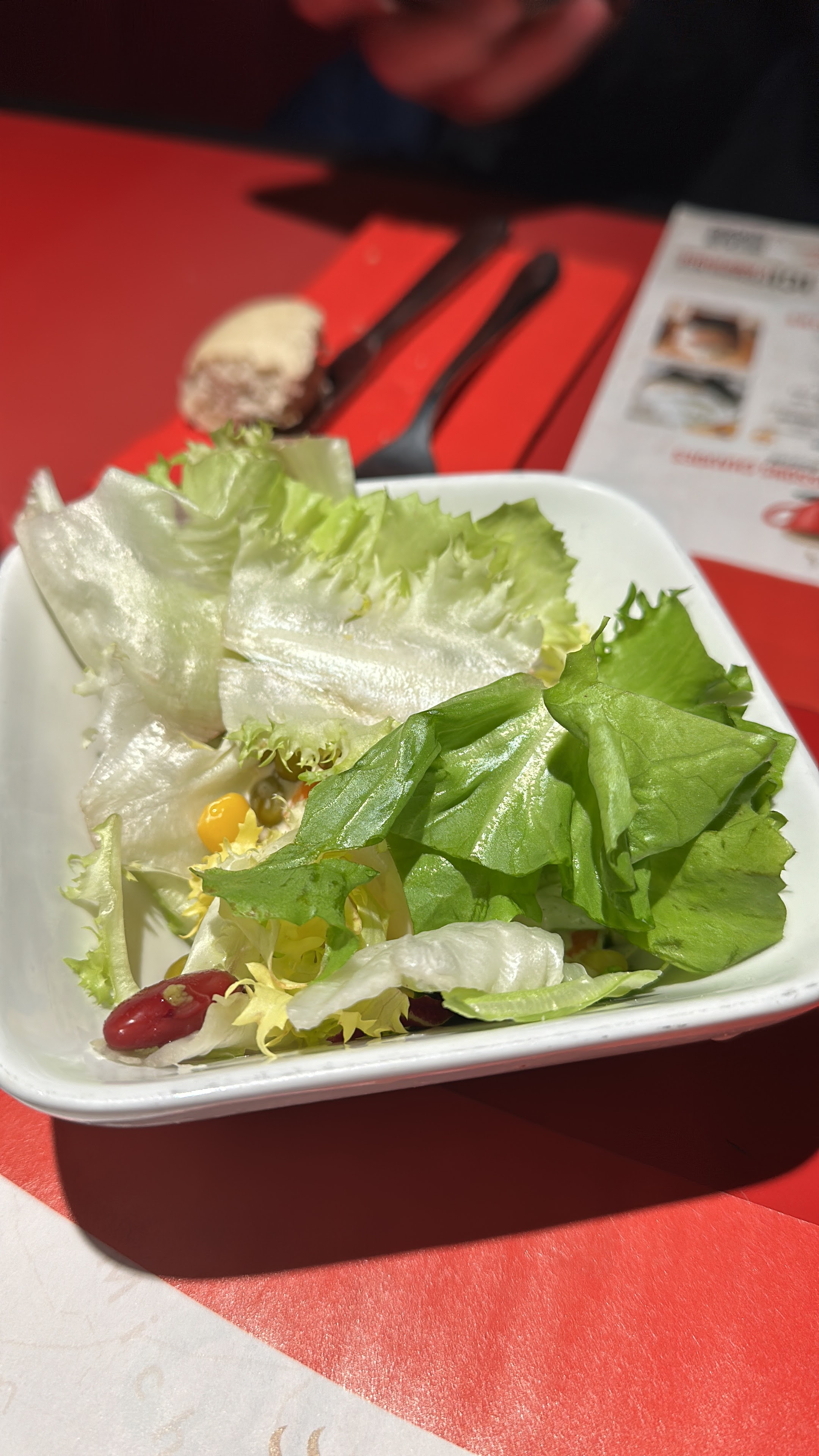 Wahou !! Déjà la salade de bienvenu euh il y avais 1 haricots rouge et 1 bout de carotte sous une montagne de salade verte . Les plats sont arrivé avant les entrée , une bavette nerveuse impossible de la couper ou de la manger , on commande un oasis pour la petite on se retrouve avec un tropico , les quesadillas une simple pâte pas cuite toute plate avec du boursin à l’intérieur nous devons pas avoir la même recette .( photo ) Enfin hyper dégoûter pour 102 euros je l’ai en travers !