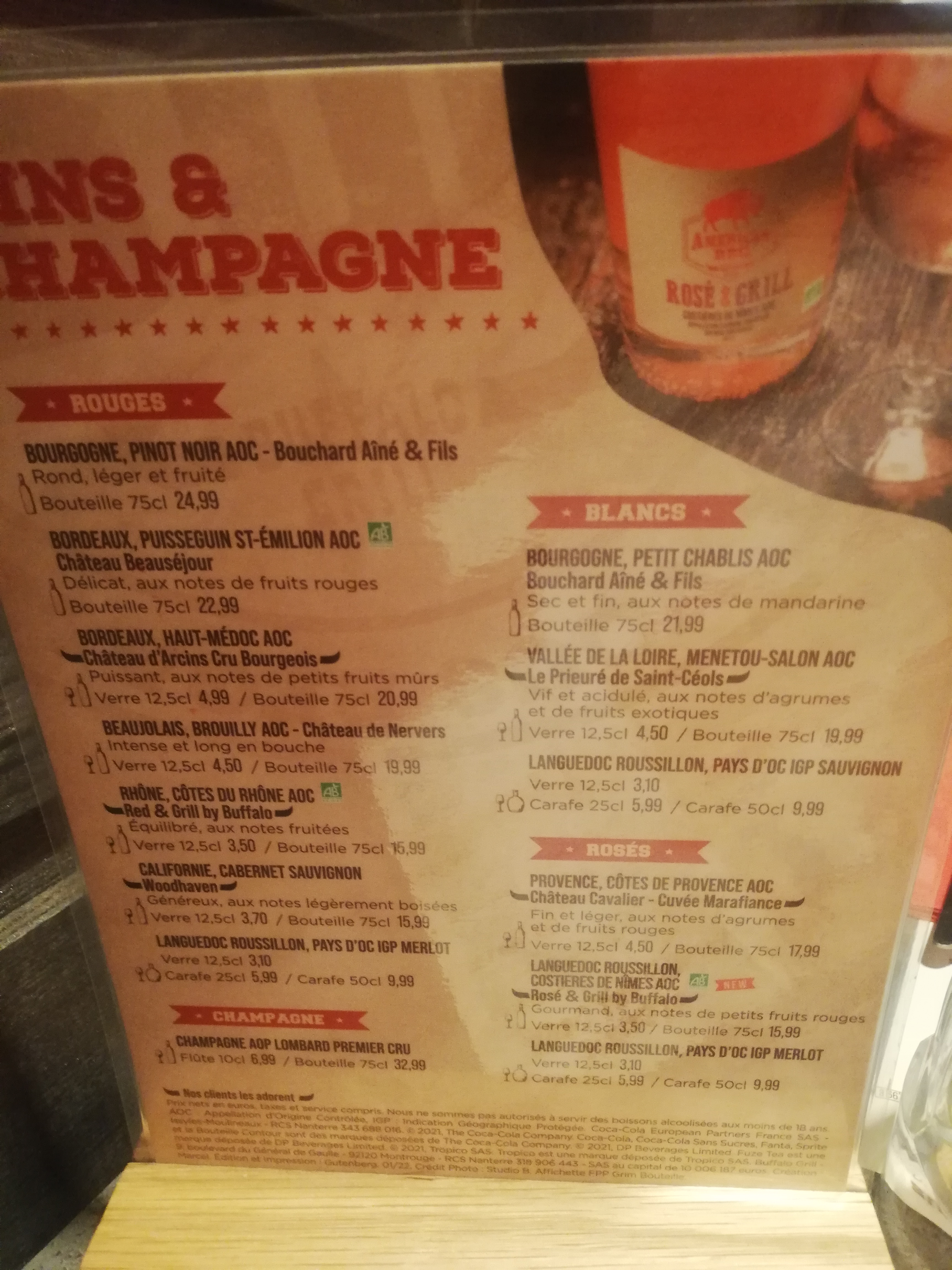 Rien à dire, concernant la cuisine et le personnel nous avons très bien mangé gros bémol qui fera que nous retournerons pas dans ce restaurant. c’est l’hygiène. qu’il laisse à désirer pour avoir déjà mangé dans des Buffalo grill. Celui-ci est vraiment sale