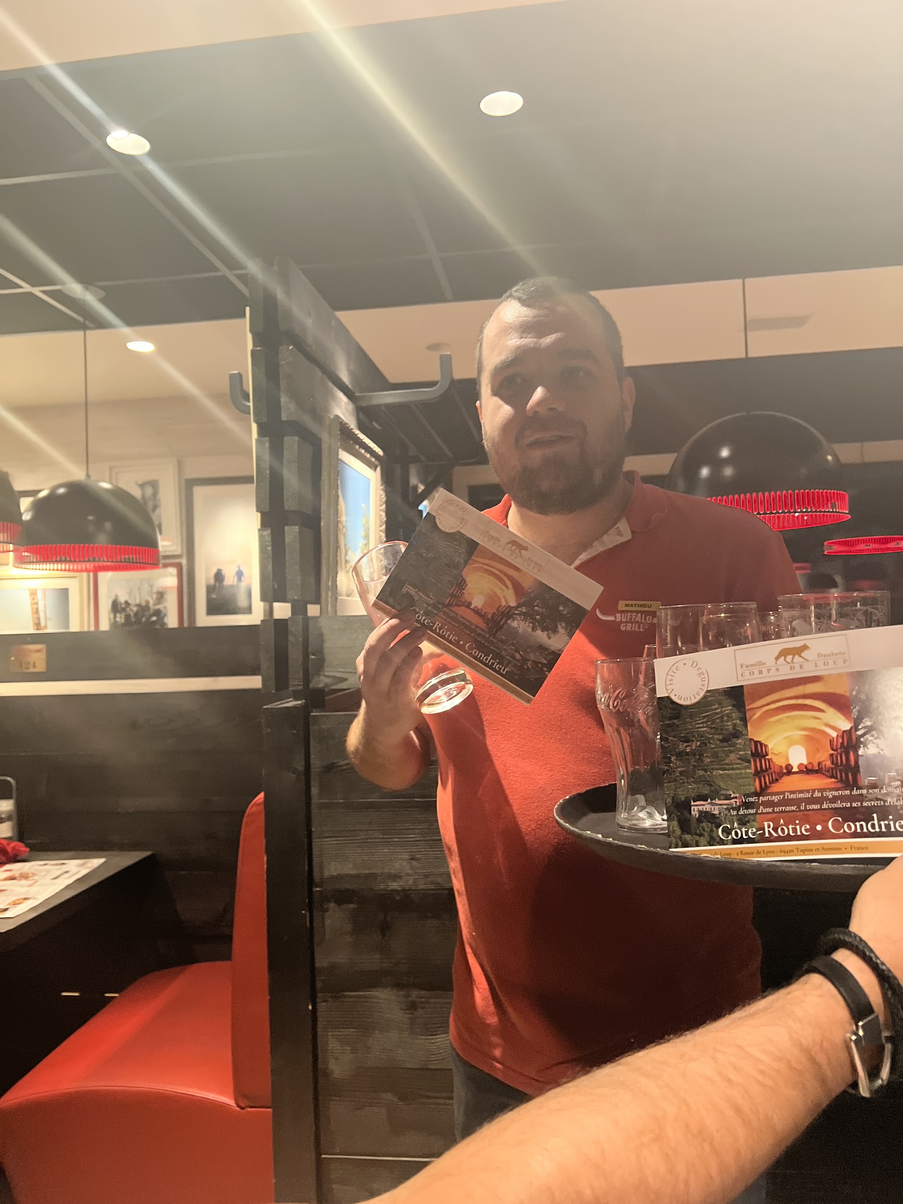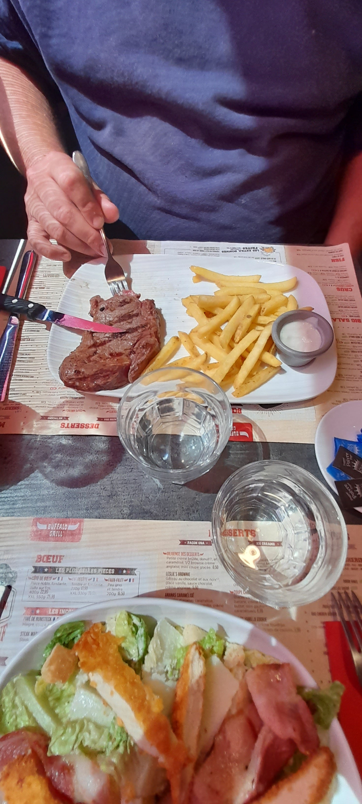 Accueil sympathique. Serveur (Aurélien) présent même si un petite peu long au service. Il est quand même très gentil et souriant.. Grand bémol en cuisine . Même si cela faisait longtemps que je n'étais pas venu au Buffalo, j'ai été déçue par certaines portions. Pour ma part ma salade était bonne mais mon fils a prit une entrecôte avec des frites. Franchement très peu de frites même pour moi il m'en aurait manqué. Il a fallu en redemander et bien sûr avec un supplément. C'est un peu abusé! Sinon le dessert était très bon et conséquent. Attention à la vaisselle sale qui traîne sur le comptoir du serveur pendant plus d'un quart d'heure alors qu'il y avait à peine 4 ou 5 tables de prises.