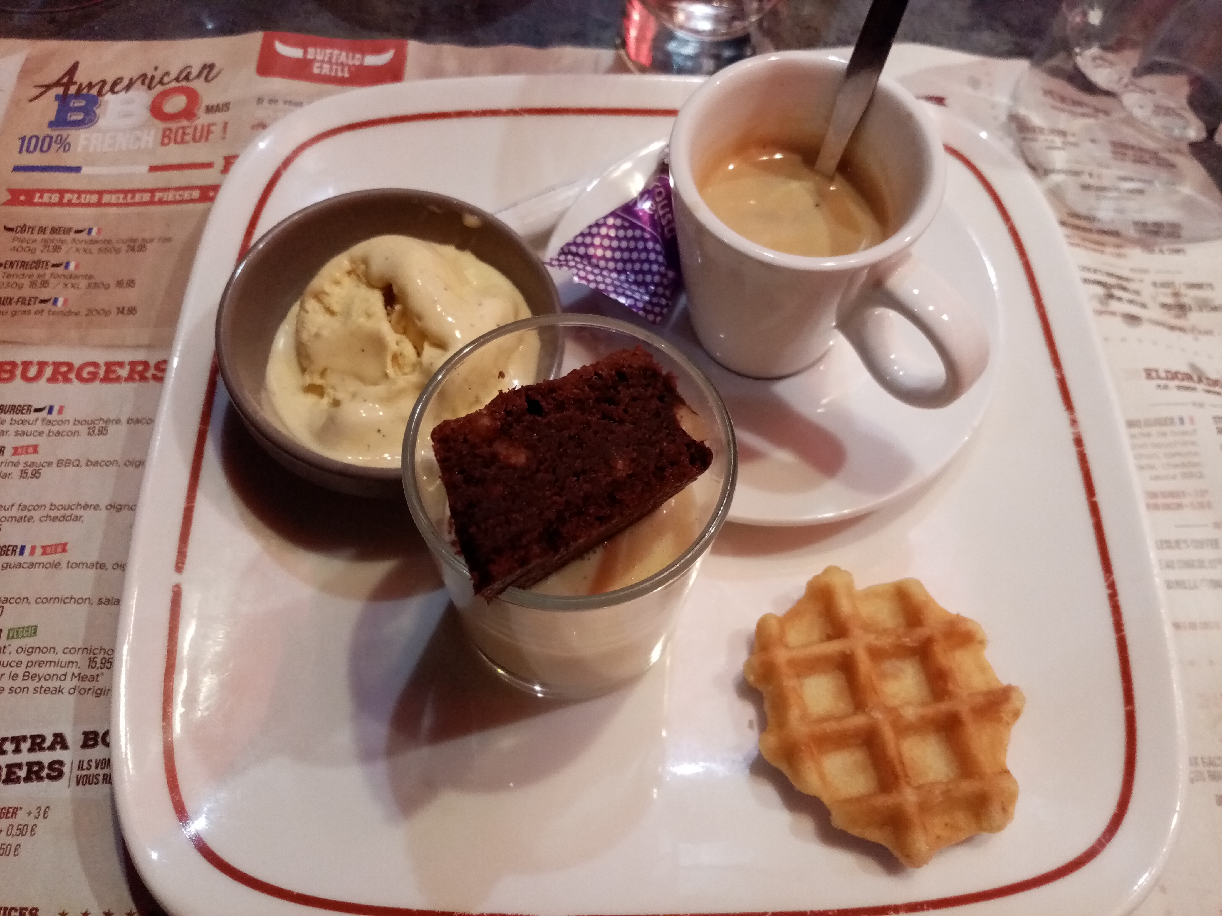 Ils servent les apéros en même temps que le plats du coup quand ils reviennent avec les plats qu'ils ont maintenu au chaud et bien chili aussi sec que le désert et le filet super cuit alors que la demande était saignante et puis franchement la taille du filet pour 25€ abusé, vraiment déçu de ce qu'est devenu Buffalo