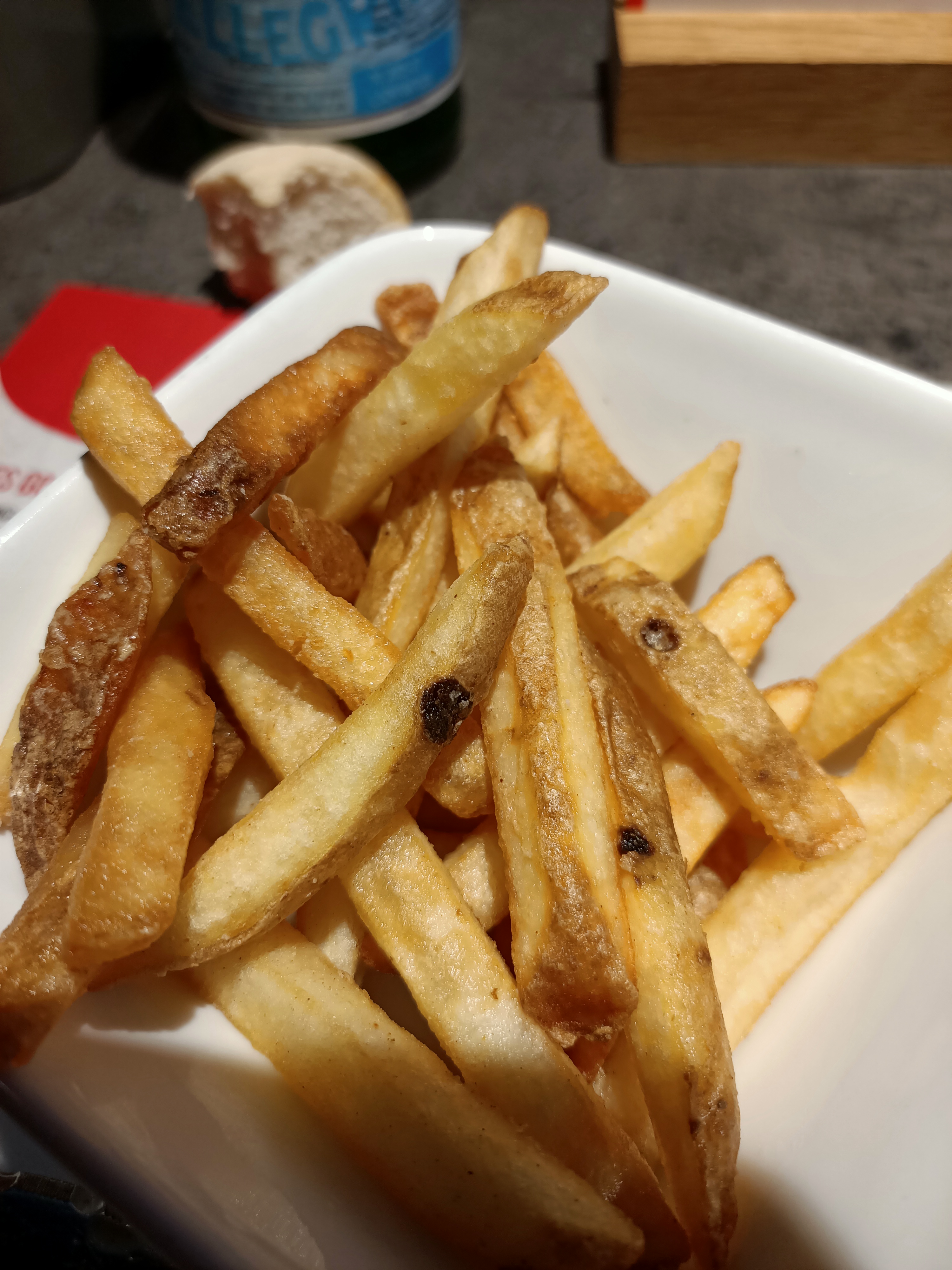 Servir un faux filet cramé d'un côté à peine cuit au milieu et presque cru de l'autre côté + des frites froides bravo. Merci pour le geste commercial de 0€