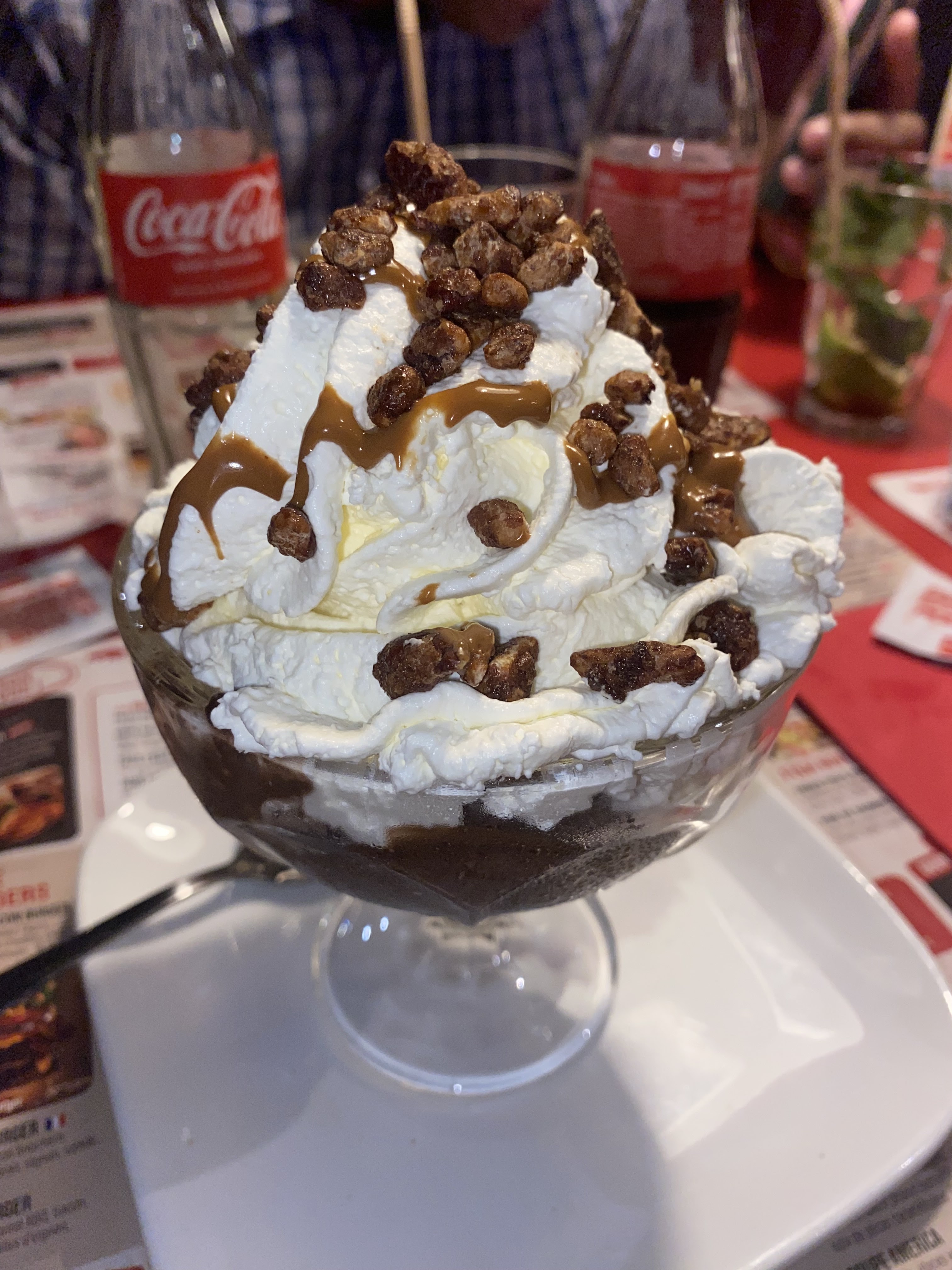 C’était vraiment très bon. J’ai pas les photos du plat mais je vous assure que c’était qualitatif, la viande était bien cuite et les frites très bonnes. Concernant la photo que vous voyez le nom du dessert c’est Coupe America, je suis fan ! De plus le serveur était très sympathique et serviable. Je recommande fortement !