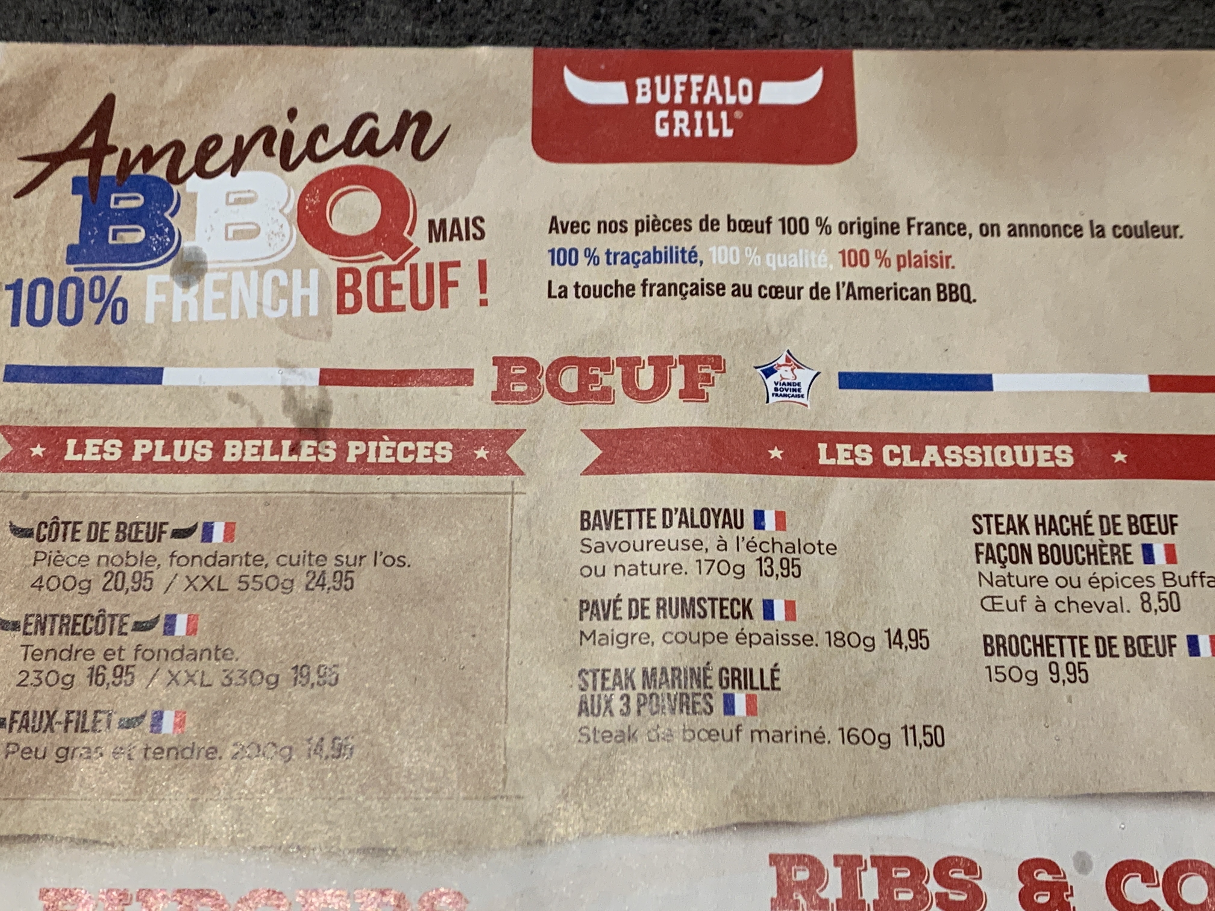 Il est dommage de ne pas avoir la qualité espérée en terme de viande, et notamment spécialité grill pour un Buffalo grill, viande et légumes servis froids, cuisson non respecté et inmangeable ( servi froid) dommage..... Le service n'étant pas responsable et se prenant les recriminations des clients qui pour le prix attendent quantité suggéré à la carte et qualité pour se régaler au vue des prix prix proposés...... Publicité mensongère, je ne recommande pas si on aime la viande ! ( alors que c'est censé être leur spécialité !!!!!) 0/5.............