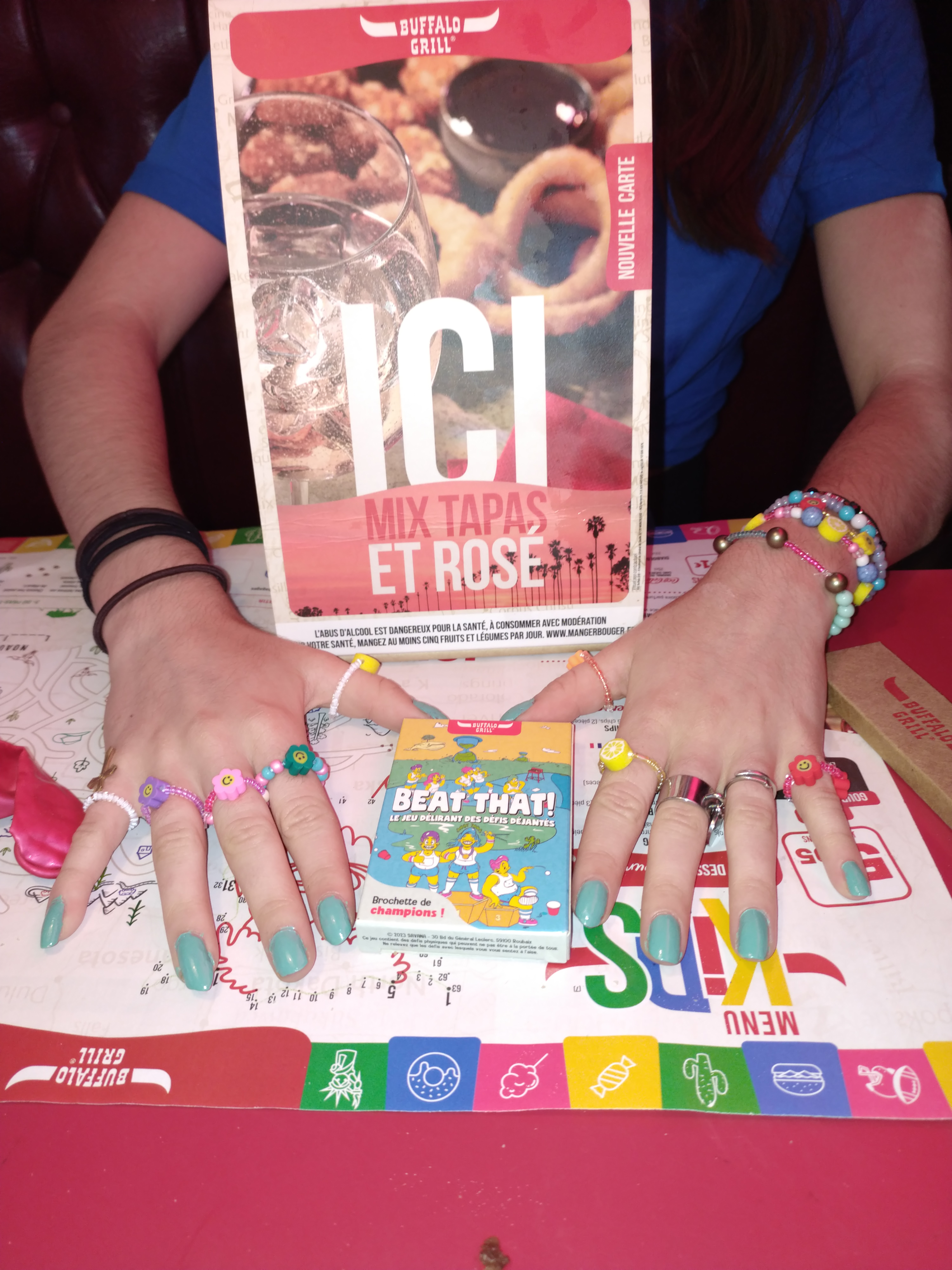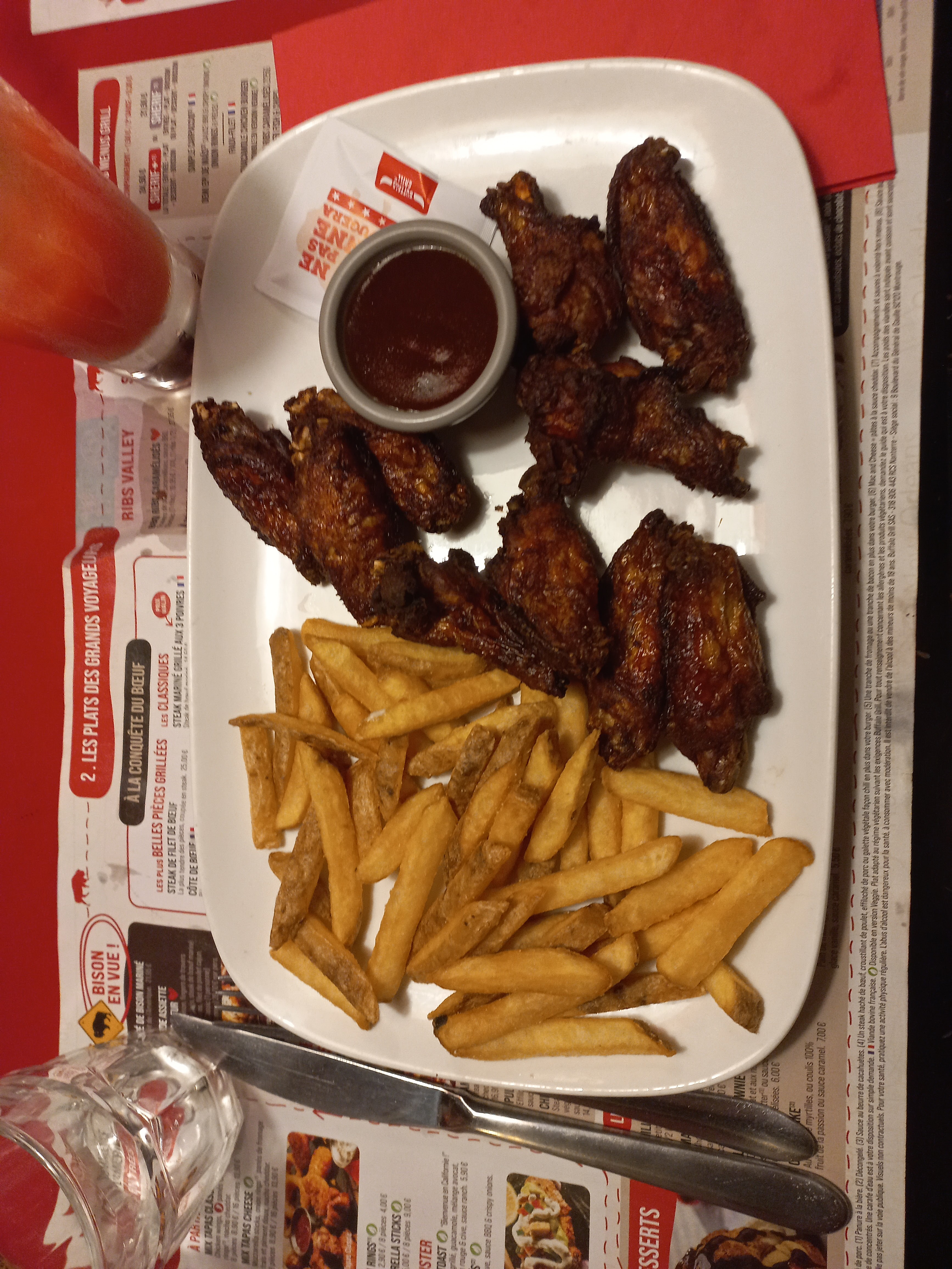 Nous aimons beaucoup notre Buffalo de Montauban, qui est parfait comparé à celui-ci. Nous attendons toujours les salades de bienvenue et l’apéritif qui est arrivé après l’avoir redemandé. Le menu enfant de notre fille est arrivé tellement tôt qu’elle avait fini avant qu’on soit servi. Deux viandes sur trois, sont arrivées froides et on a eu droit au cheveu dans les frites. Je ne me souvenais pas que les viandes étaient si nerveuses. Ça fait une grosse quantité de gras sur l’entrecôte. Pas de rince doigt alors que j’ai pris des ribs , ils sont arrivés bien plus tard, on avait fini depuis un petit bout de temps. Peut-être une soirée sans. On ne recommande pas.