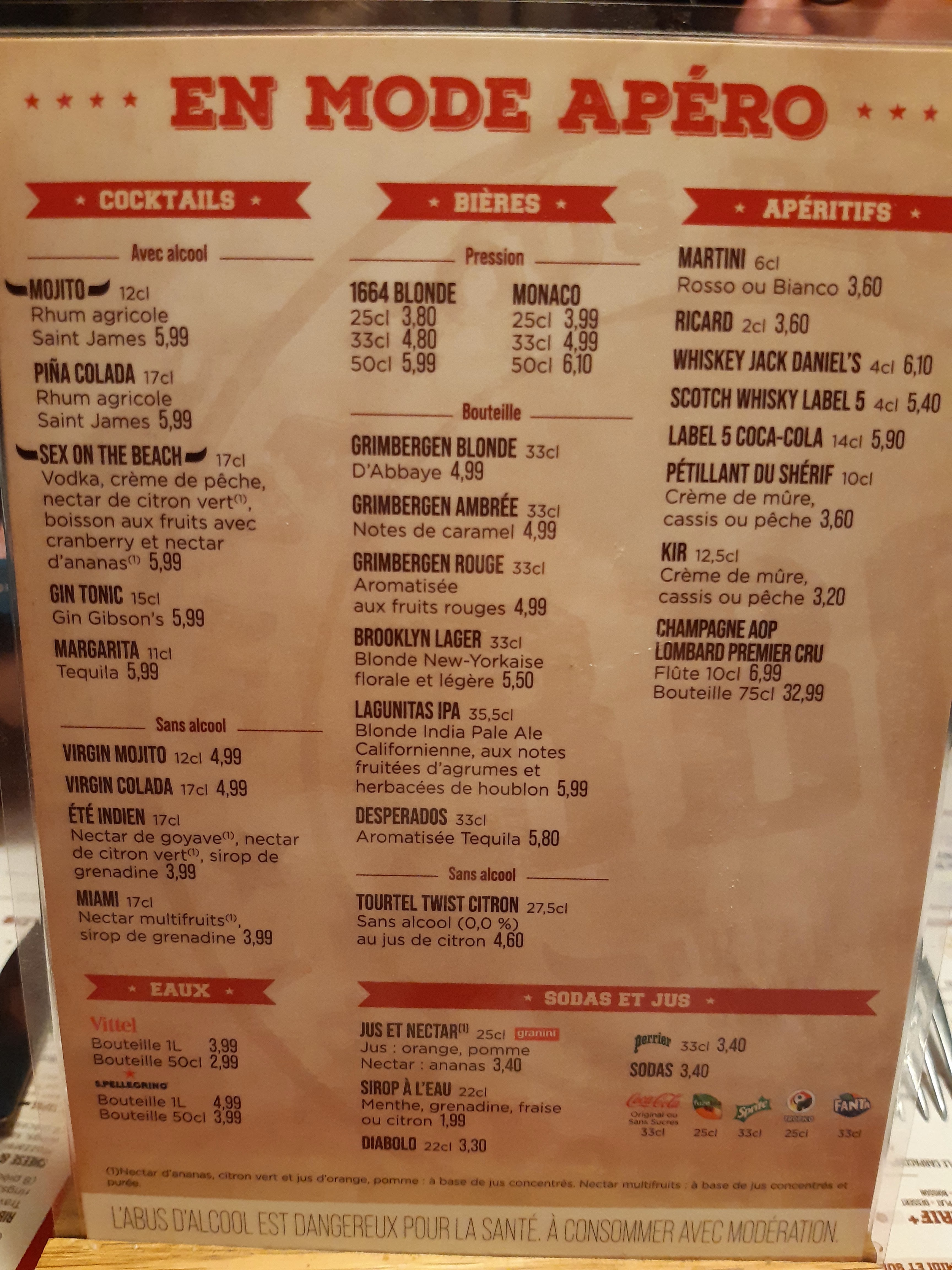 Quelques manques par rapport à la carte : bière pression, steak tartare ! Heureusement Lucie a su rattraper les problèmes. Merci Lucie