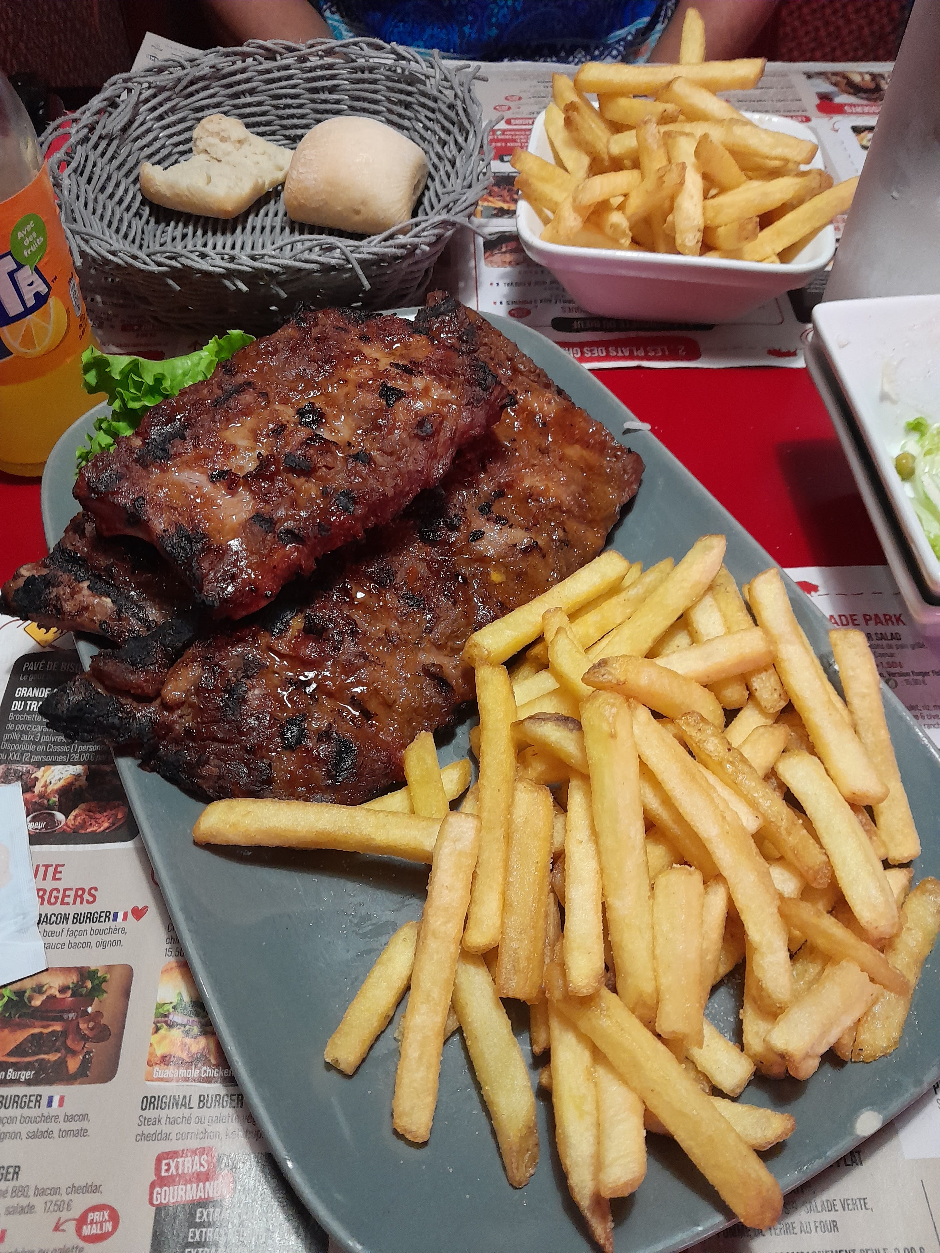 Entrecôte frite demandé saignante servi bleu Bbq RIbs accompagne frite Correct Service et acceuil parfait clovis est très bien serviable et professionnel merci