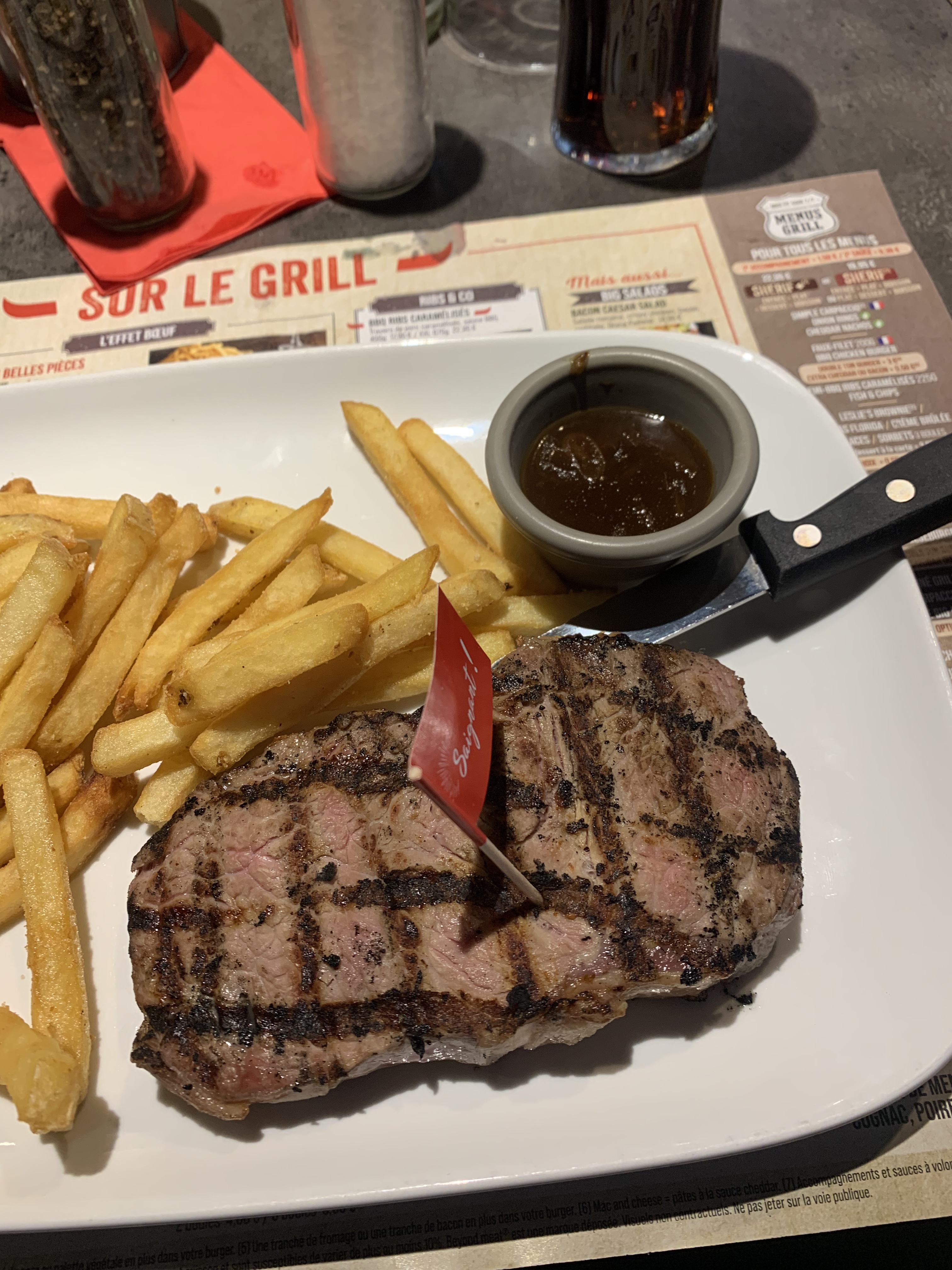 Bien et bon restaurant La viande demandée bien cuit ne l’était pas tout à fait mais cela n’a rien gâché à l’ambiance et le service. Dommage que tout devienne automatique et que le serveur ne soit plus là pour prendre commande. Il faut tout faire sur son téléphone avec un QR code. En plus les accompagnements sont payant. Avant on pouvait avoir frites et haricots sans payer plus . Autrement personnels très sympathiques et pas d’attente pour manger ! A recommander
