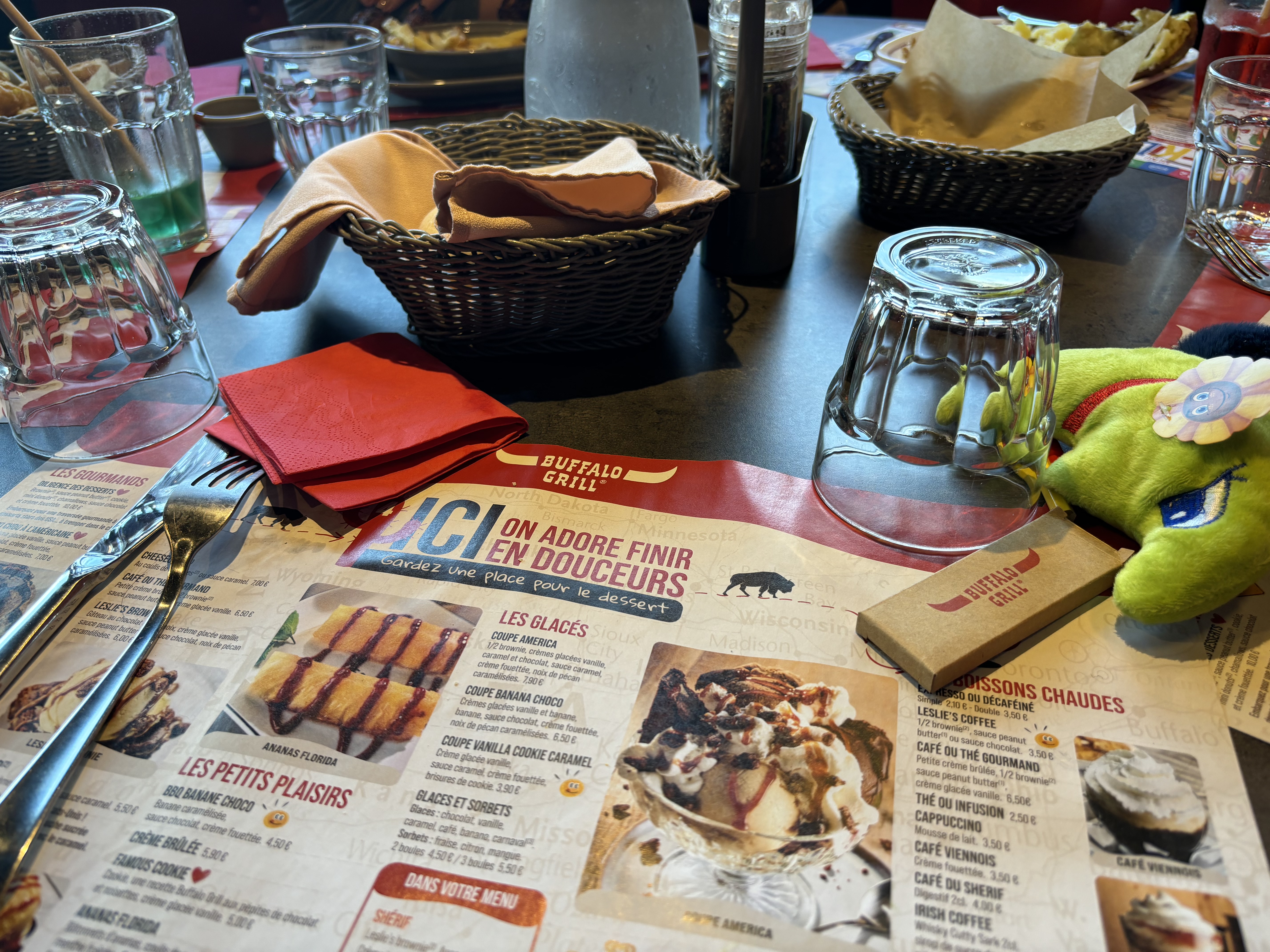 C'était ouvert le 14 juillet au soir, pratique, un bon point ! Après, c'est un buffalo grill, pas de grandes surprises culinaire ! Le dessert du moment était quand même pas mal ! Le mauvais, alors que le restaurant est loin d'être plein, le maître d'hôtel installe une famille avec deux enfants insupportables à la table à côté de la nôtre : cris, gémissements, chahut, désobéissance, et en plus ils ont rien mangé, cassant les pieds à leurs parents, et nos oreilles, pour leur piquer ce qu'ils avaient dans leur assiette ! Nous ne nous sommes pas attardé...