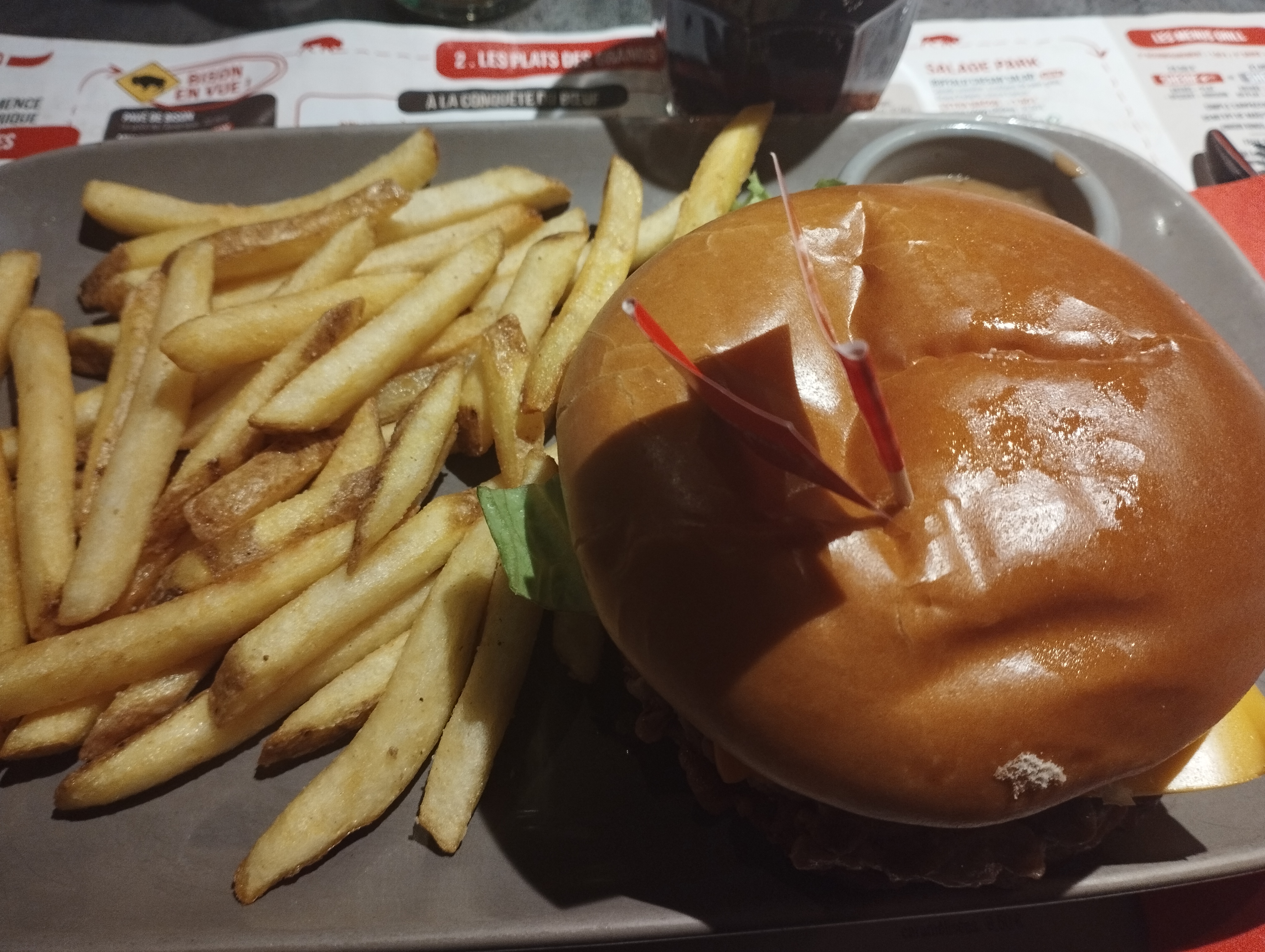 Si on parle du lieu, c'est Buffalo grill c'est américain, le dresscode des serveurs, tout y est. Mention a la famille qui est venue en dodge ram se garer devant la fenêtre, bienvenue en Amérique ! Pour faire simple les points positifs : Les plats à partager, le pop corn et la salade servis pour patienter, et mes collègues ont semblé aimé les ribs. Puis maintenant le reste : Les prix, les burgers sont chers et très peu garnis, c'est pas mauvais mais on s'attend à plus pour le prix. Les frites sont cool puis la sauce ranch est vraiment bonne. Puis l'autre étoile en moins, c'est pour la carafe d'eau qu'on a attendue pendant 20 minutes. Les serveurs sont expéditifs et pas spécialement chaleureux. A tester pour vous faire votre opinion !