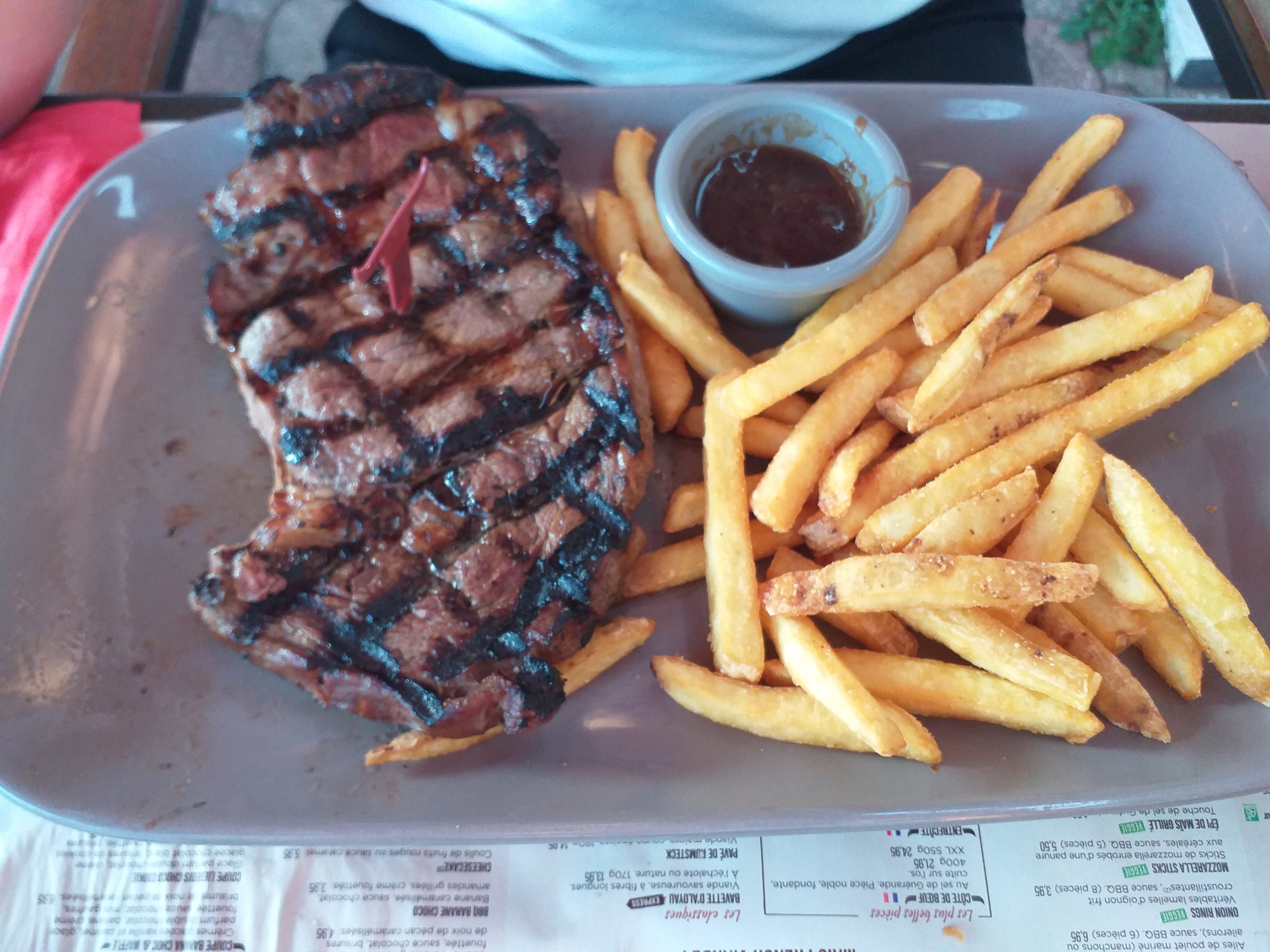 Serveur plutôt poli, mais doit avoir un soucis avec les carafes d eau après trois demandes toujours rien La sauce roqueforts laisse un goût de produits vaisselle en bouche Bon si vous êtes artisan comme moi n y allez pas, vous repartirez avec une faim car les 5 frites qui se battent en duel ne remplissent pas les gaillards que nous sommes Heureusement qu il y a le mc do en face