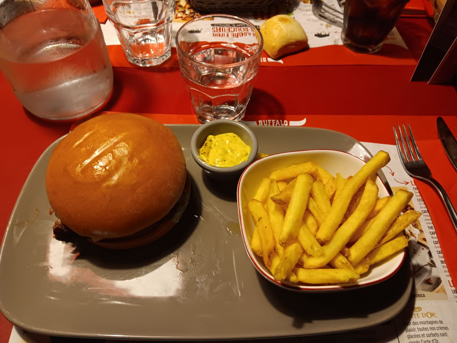 Rien n’allait. étant de la restauration avec mon compagnon, nous pouvons comprendre beaucoup de choses.. mais la… on ne peut trouver aucune excuse. Service déplorable : on ne nous fais pas part des ruptures et on nous sert des accompagnements que nous n’avions pas demandé à la place.. Serveuse ET serveur désagréable et pas du tout professionnel.. Presses de finir… Très déçue de la qualité déclinante de ce Buffalo.
