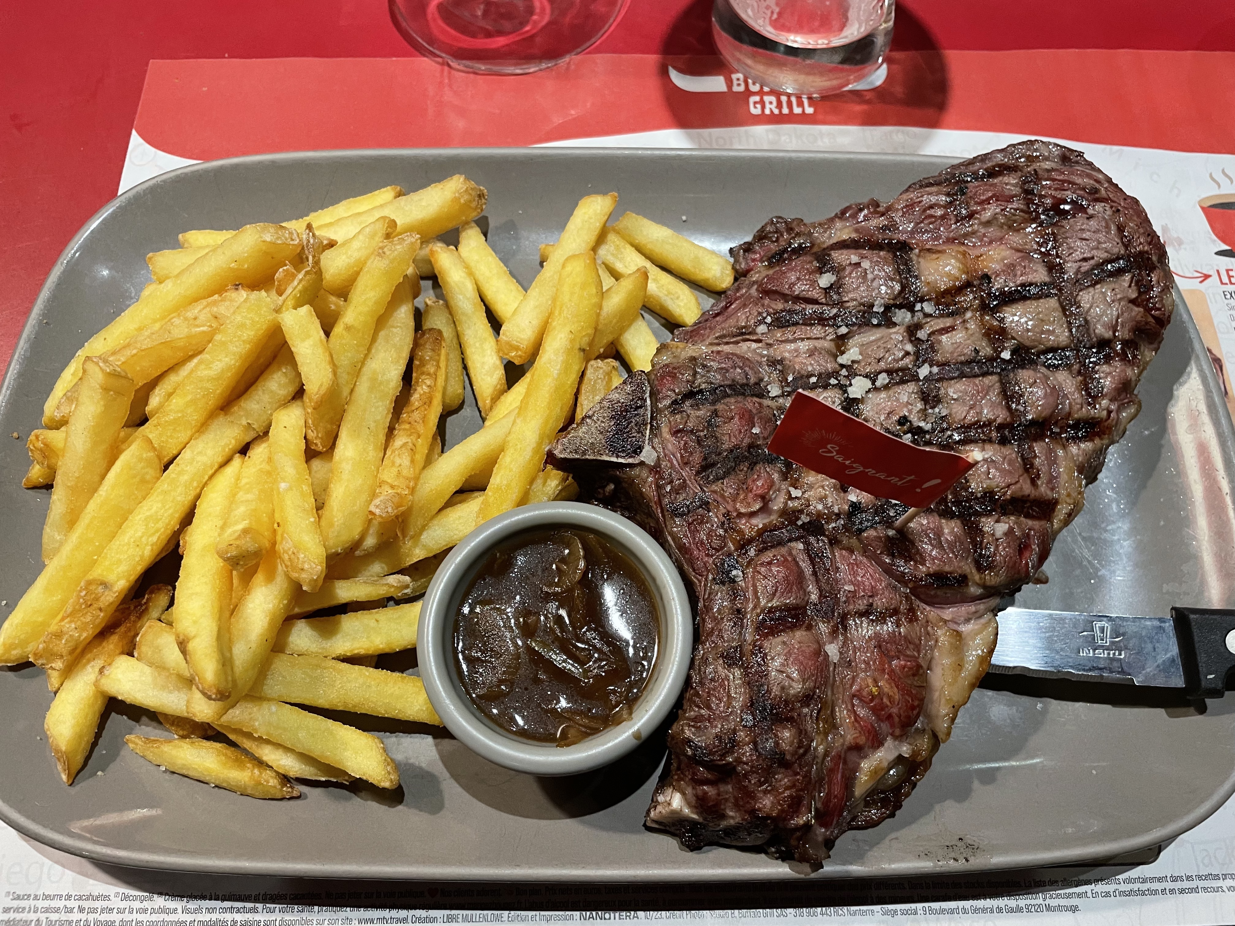 Les Buffalo se suivent mais ne se ressemblent pas… dommage. Nous regrettons la trop longue attente à l’entrée (nous sommes seuls mais il est midi c’est l’heure du briefing que nous aurions aimé ne pas avoir à entendre… ), l’addition qui ajoute 27 euros à la note car un des repas à été compté deux fois, l’absence de pochette jeux pour les petits qui fait pourtant la signature de la maison. Néanmoins le personnel est gentil et fait de son mieux pour compenser les équipes manquantes semble t il. Les plats sont toujours constants et savoureux.