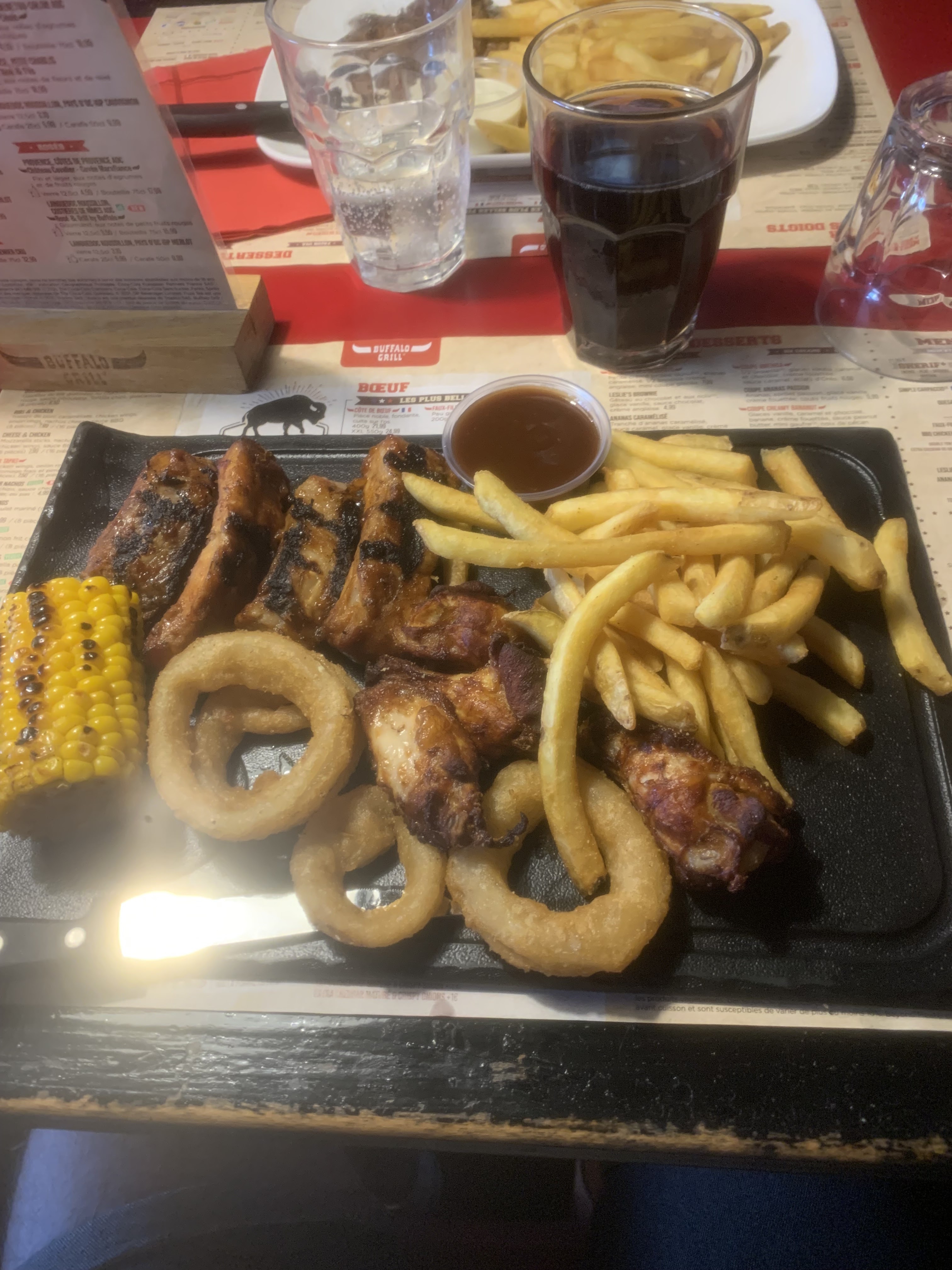 De passage samedi midi (25/06) pas de brochettes de poulets, pas de brochettes de bœufs, pas de pomme de terre, pas de coca zéro et j’en oublie.. c’est incroyable, un samedi midi avoir autant de choses non dispo ce n’est pas logique et correct. Les serveurs au demeurant très sympathique, mais que ce fut laborieux. Dès le début avec les salades qui arrivent sans sauces je me suis dit ça va être compliqué ce service… je ne me suis pas trompé. Réclamer 3 fois une carafe d’eau, les plats qui se font attendre alors qu’il y a pas la grosse foule, les desserts 10-15 min pour arriver (certainement oubliés) Bilan déçu, les frites certes à volonté mais la quantité… j’ai pas osé en redemandé, aillant de la route je ne voulais pas attendre 20 min de plus.. Peu probable que je repasse ici alors que je suis un habitué d’autres Buffalo du coin.