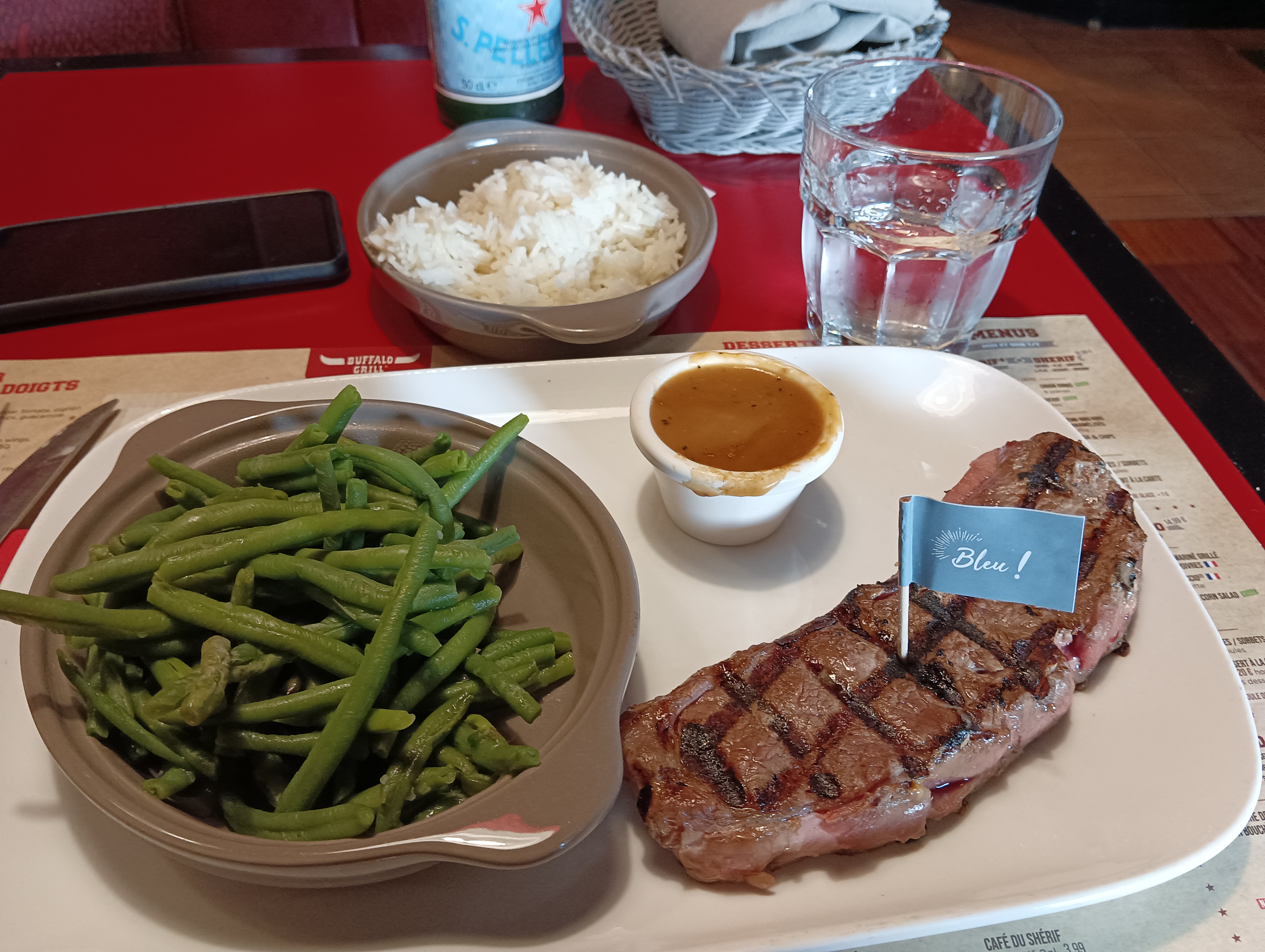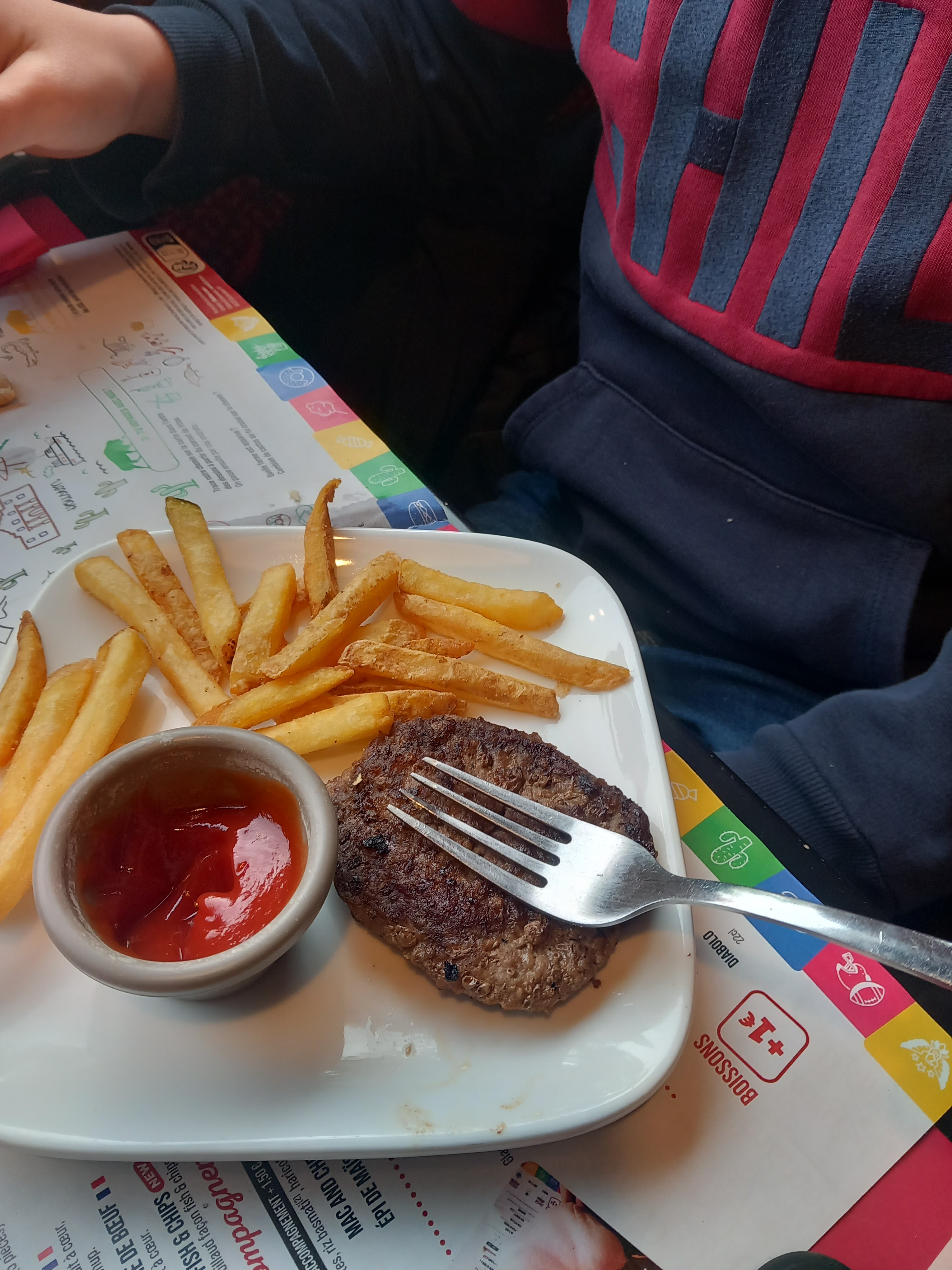 La viande était très bonne et la cuisson parfaite. Nous avons été servis par Fabien, qui était très aimable, attentif et réactif. Les enfants apprécient toujours les jeux mis à leur disposition. En revanche nous avons l'impression que les portions diminuent avec le temps. Heureusement qu'il y a toujours les accompagnements et les sauces à volonté !