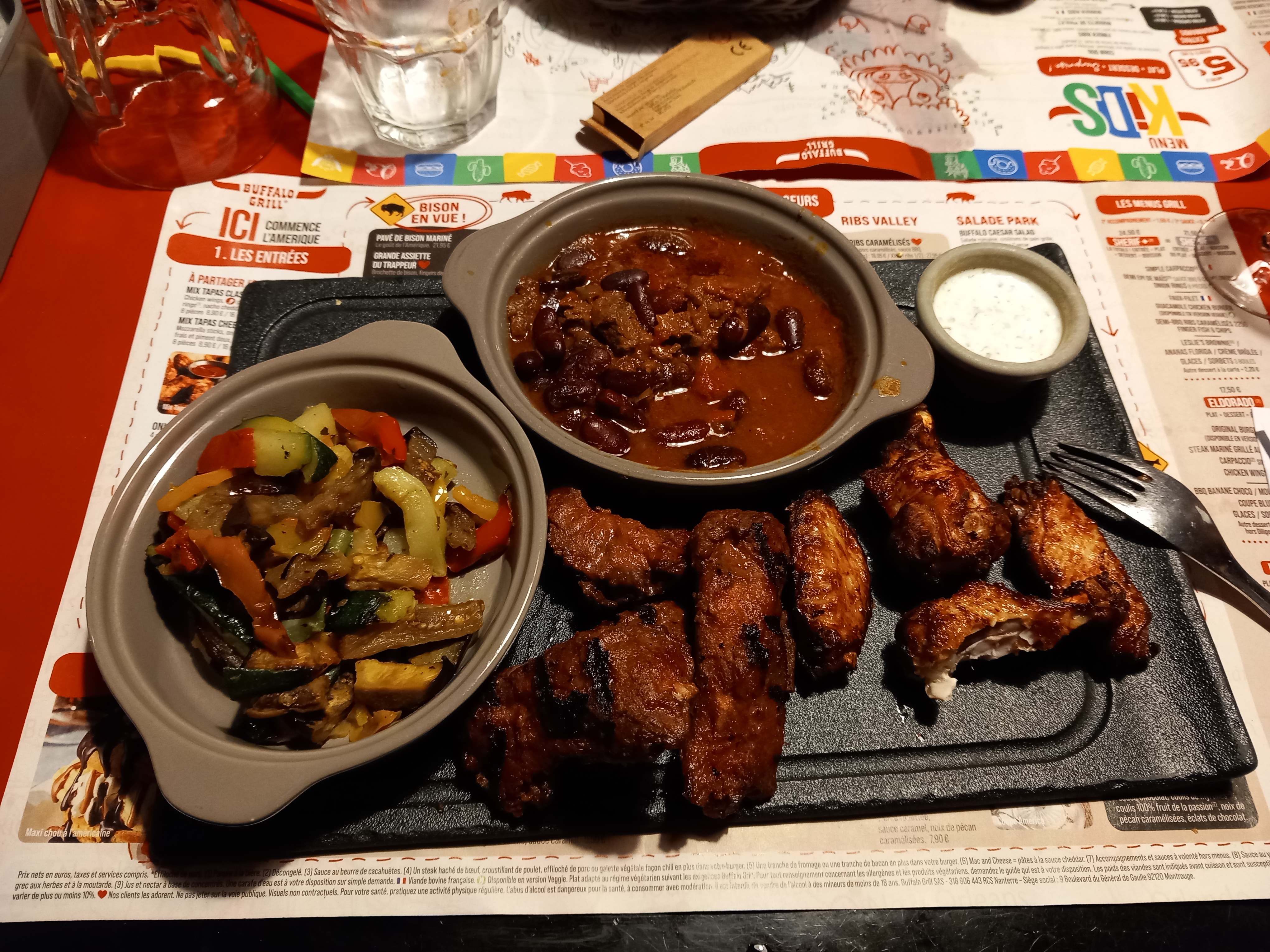 Un steack enfant archi cuit , minuscule et sans goût ! Lorsque la serveuse à amené l'assiette a mon fils et à vu sa tête ainsi que la notre, elle nous a expliqué qu'il fallait que le steack soit bien cuit pour éviter les intoxications car se sont des surgelés !!! Une honte ! Ce n'est pas non plus le peu de frites qu'il l'ont rassasié ! Et ils trouvent ça normal de servir ça... une chose est sûre nous ne reviendrons plus chez buffalo, vraiment déçu 😞 😡