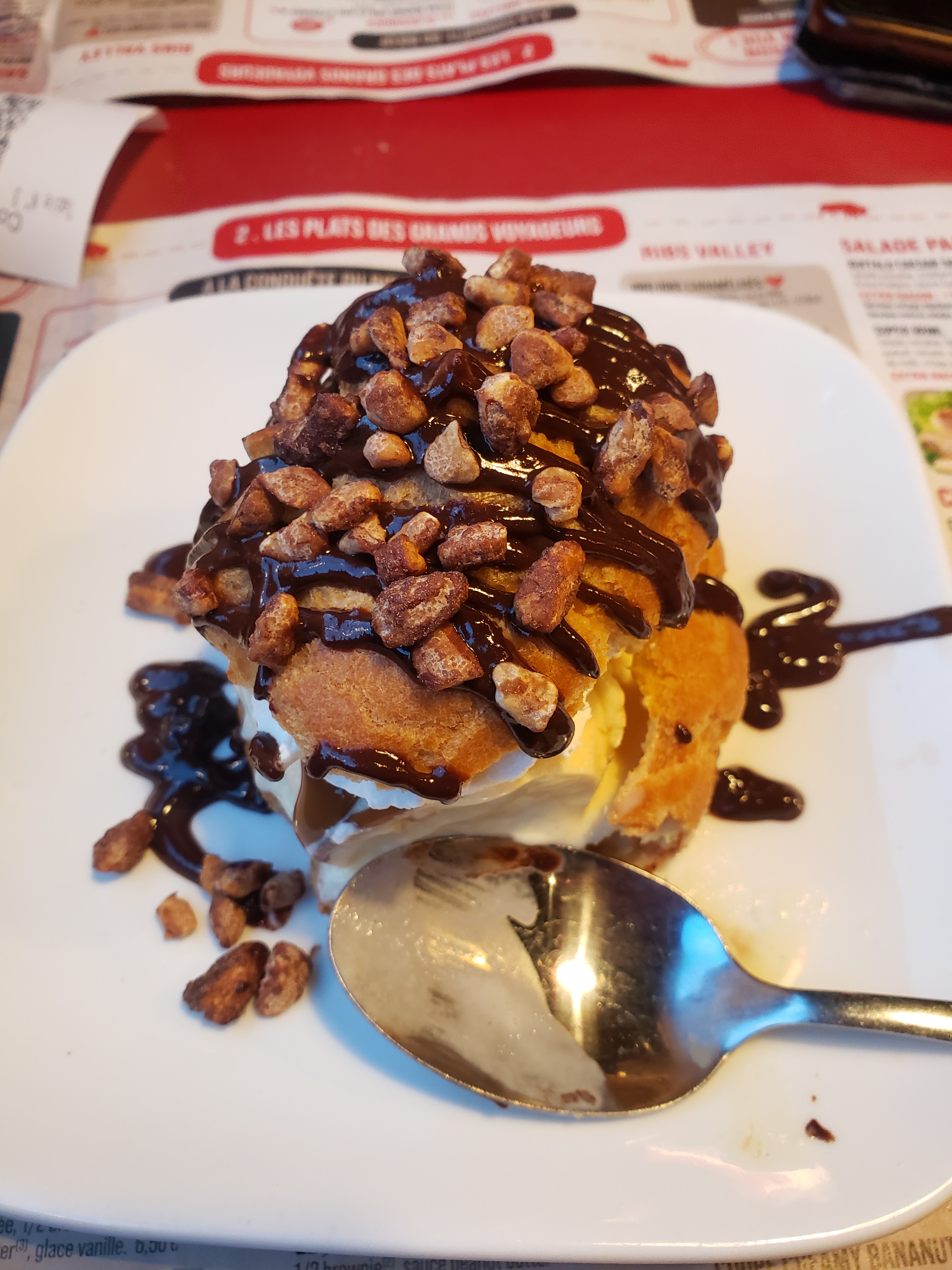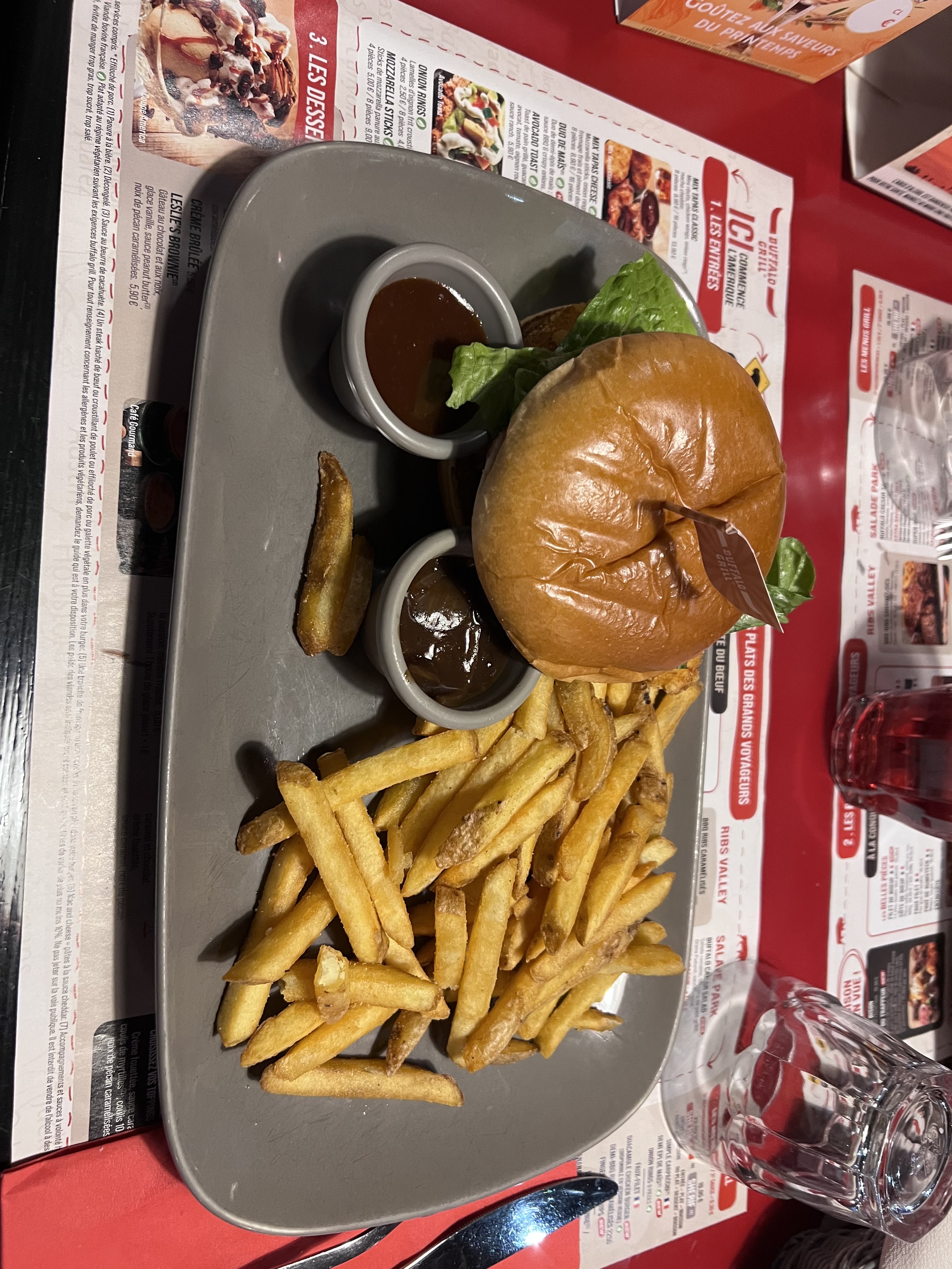 Première fois que je viens dans ce Buffalo Grill le serveur qui nous as servi Amie était sympathique et rapide dans la prise de commande. j'ai pris un Ribs caramélisées en XXL qui était très bon avec les frites qui sont à volonté et je ne me suis pas privé. En dessert j'ai pris l'American Waffle qui était très bon j'ai bien aimé la sauce au beurre de cacahuète et les noix de pécan qui était très croustillante. Je recommande