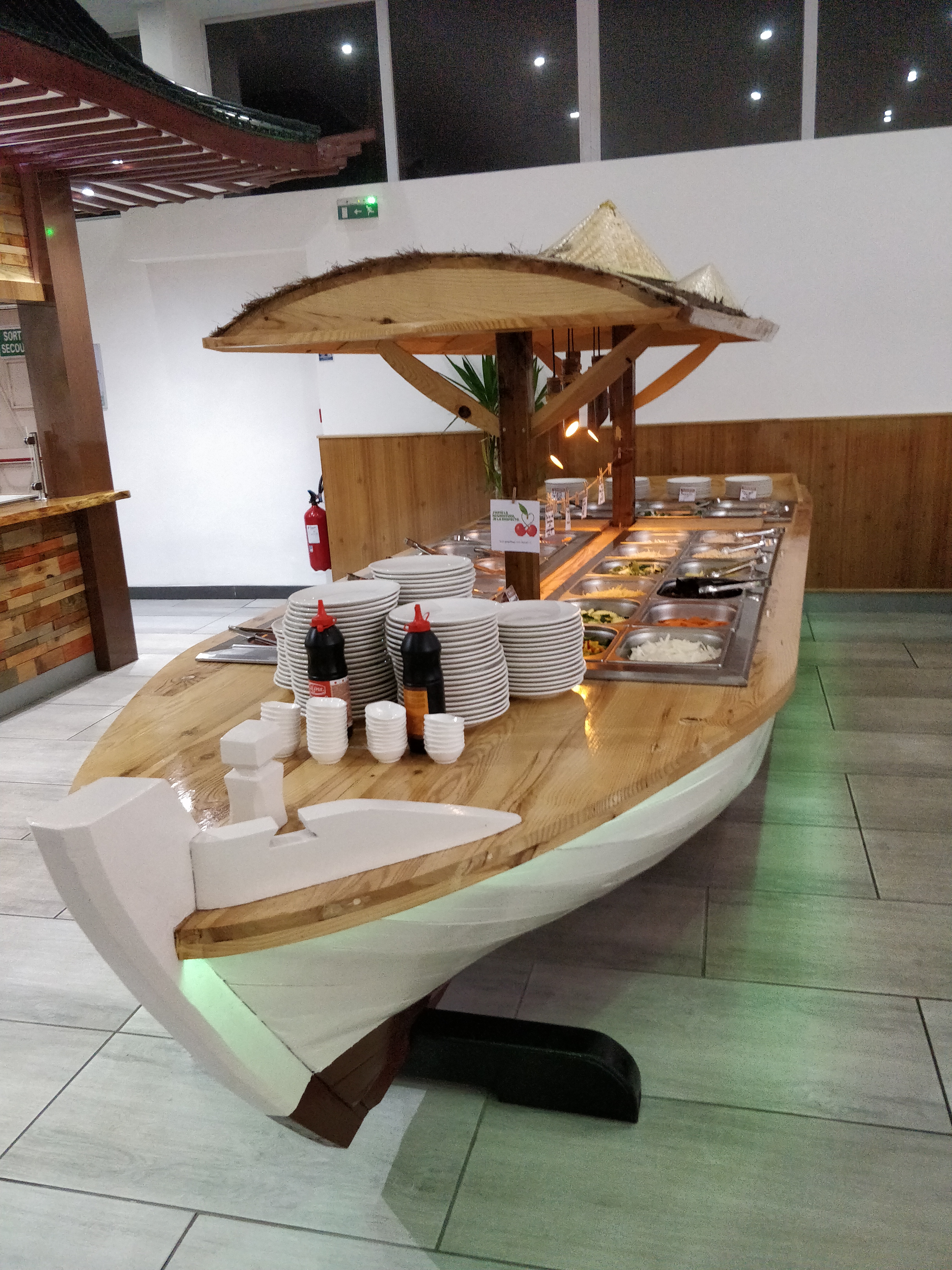 Commençons déjà par le cadre et le service ou le personnel est très sympathique. Notre serveur était même blagueur et pour un samedi soir entre amis, ça passe bien! Ensuite, le cadre est propre. Le point positif est l’espace jeux pour les enfants un peu à l’écart et c’est un bon point. Bon, au moment de payer, on voit que derrière le bar c’est un peu le bordel et un peu de rangement ne ferait pas de mal… ça dénote un peu au reste du cadre avec les poissons, les lego qui sont vraiment sympathiques… Passons côtés cuisine maintenant ou la, je ne peux que confirmer les avis précédents… étant les 1ers arrivés dans le resto, les bacs étaient à moitié plein et rien n’était chaud… que ce soit nems, frites etc… tout était tiède. À ça s’ajoute quelques « incontournables » qui n’étaient pas là… comme des samoussas… Dans l’ensemble, que ce soit le riz, les nouilles, tout est assez sec et sans vraiment de saveur… Quant à la viande ou charcuterie, ça ne donnait pas envie et meme pour les crudités, je trouvais que ça manquait de fraîcheur… Après, ça reste un buffet donc on ne s’attend pas à de la gastronomie… mais aux vues des prix, j’attendais clairement mieux que ça!