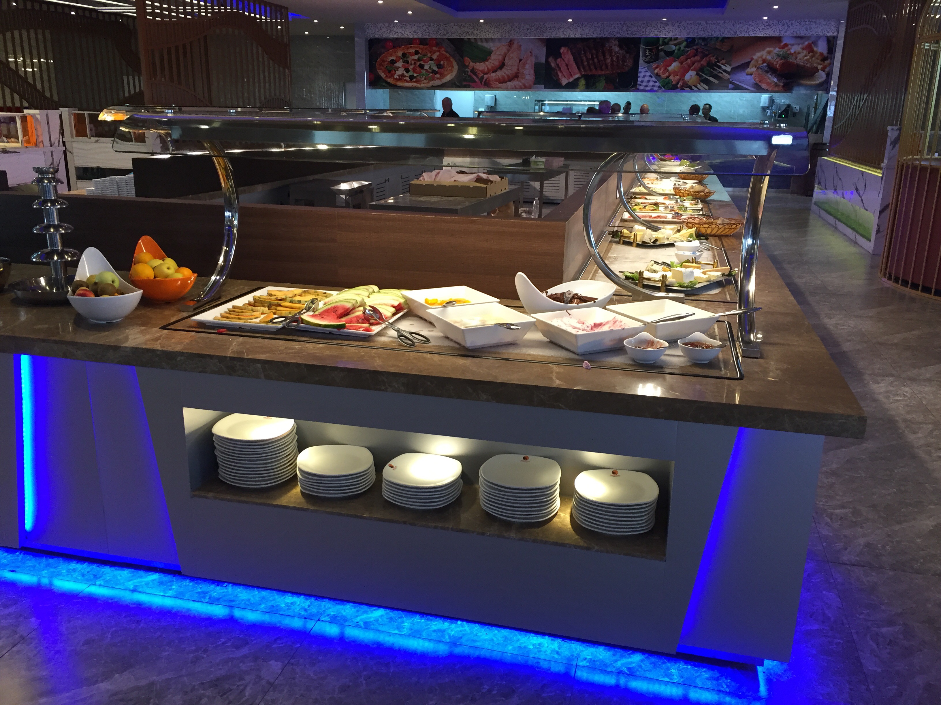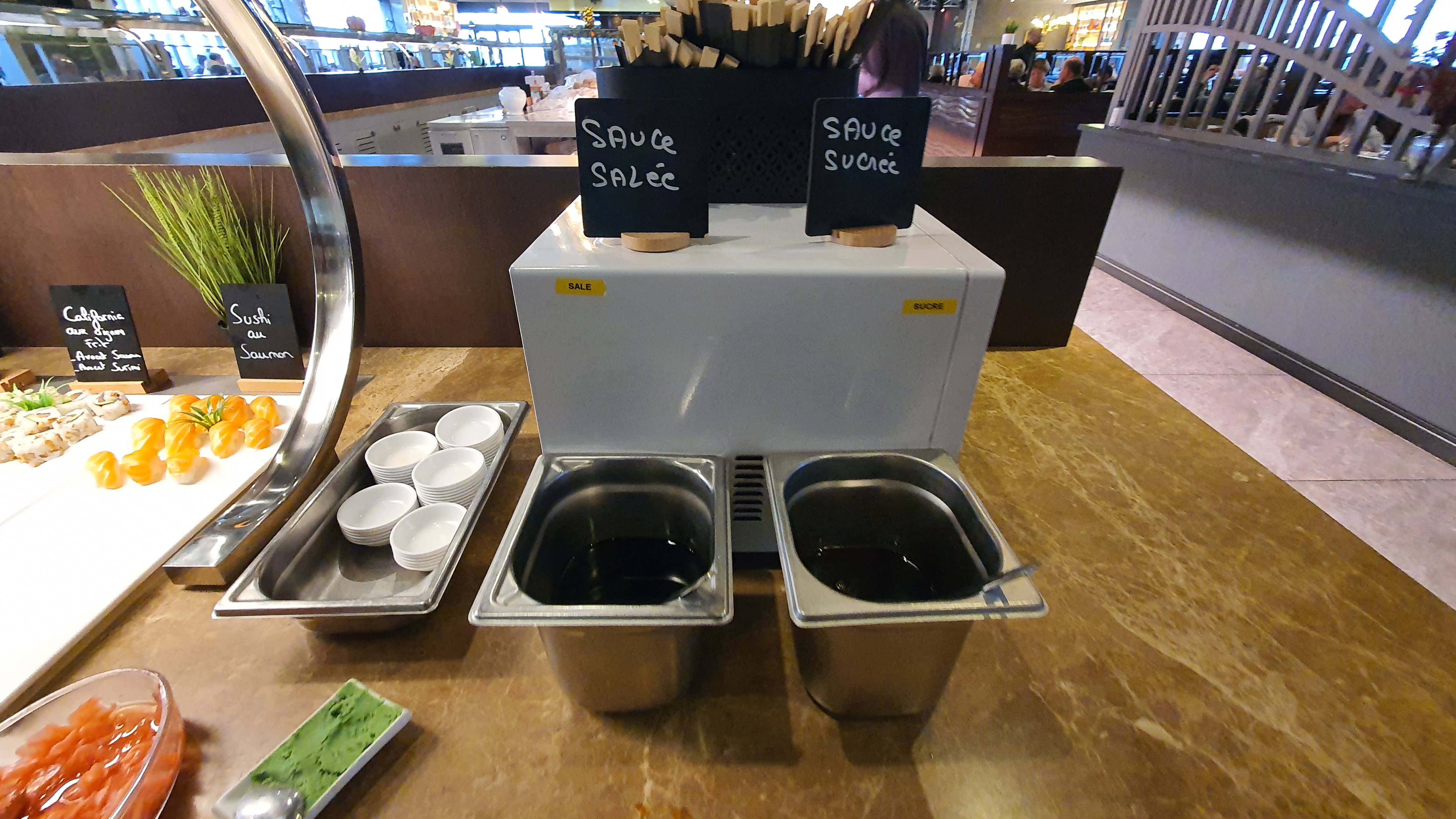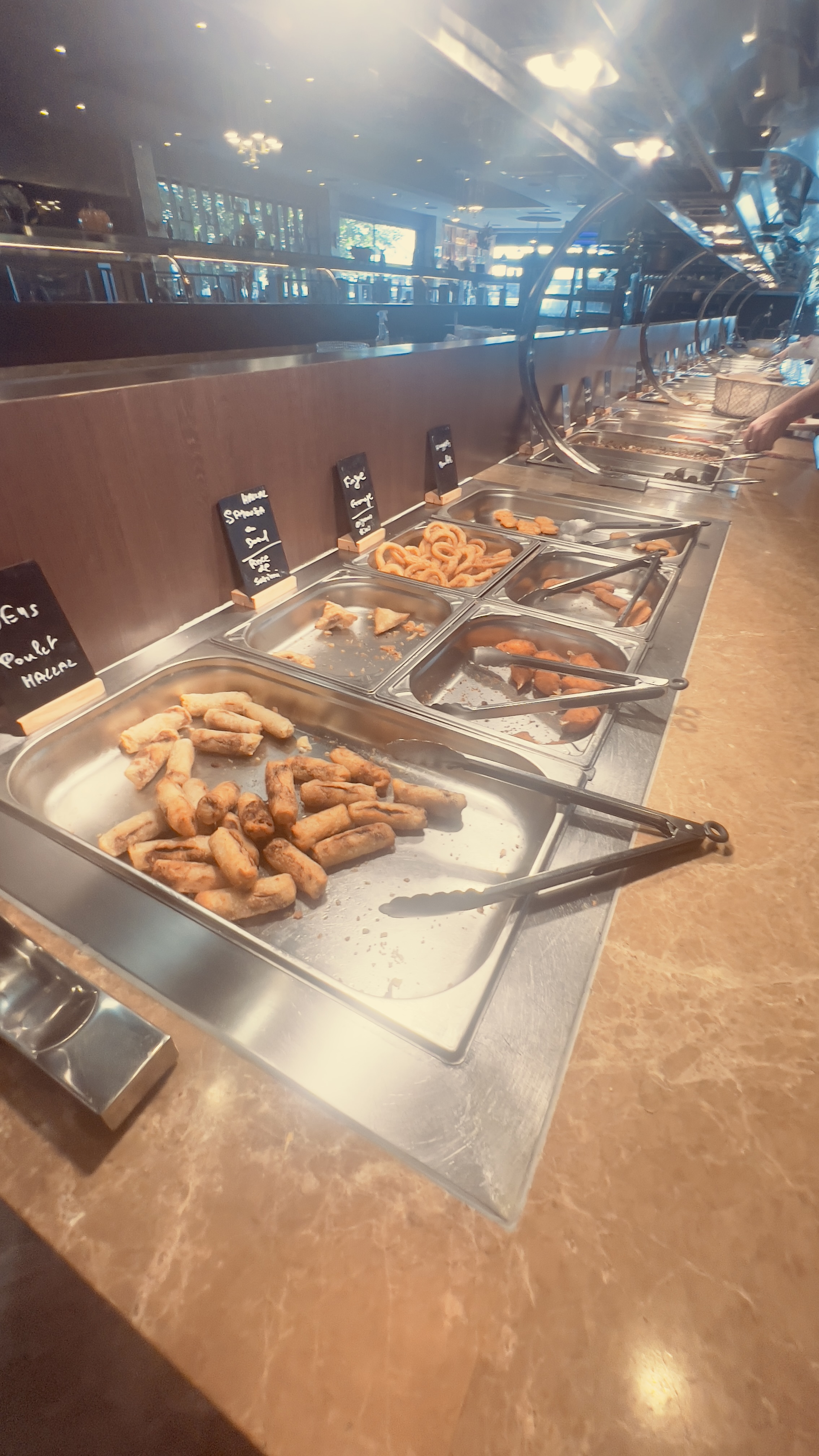 Plats recyclés, réchauffés… presque pas d’accompagnements à part des frites et du riz très très fade. De plus, il y avait des mouches enfermées dans la vitrine avec la viande… Le buffet correct reste celui des sushis qui paraissaient plutôt frais. Bref plus jamais pour nous… Dommage le concept était sympa.