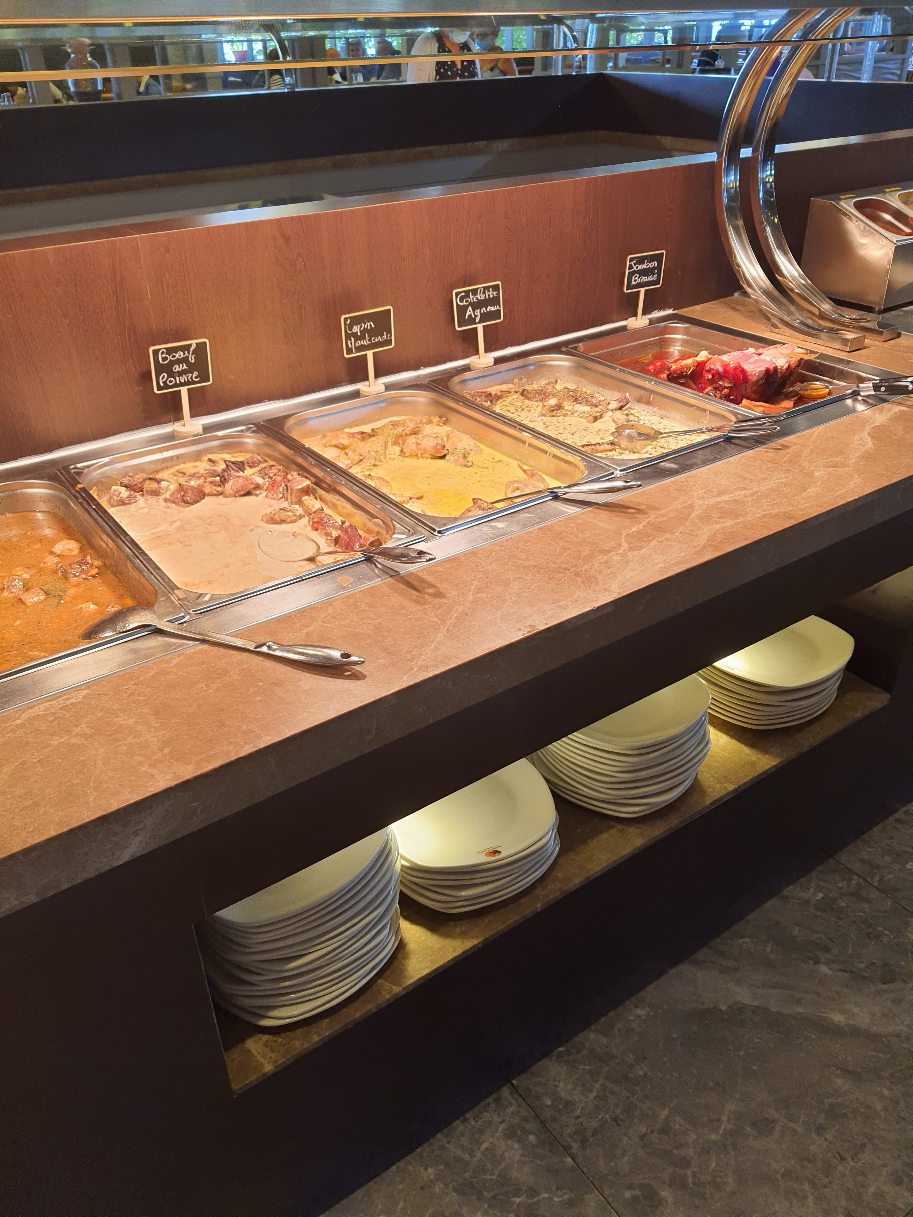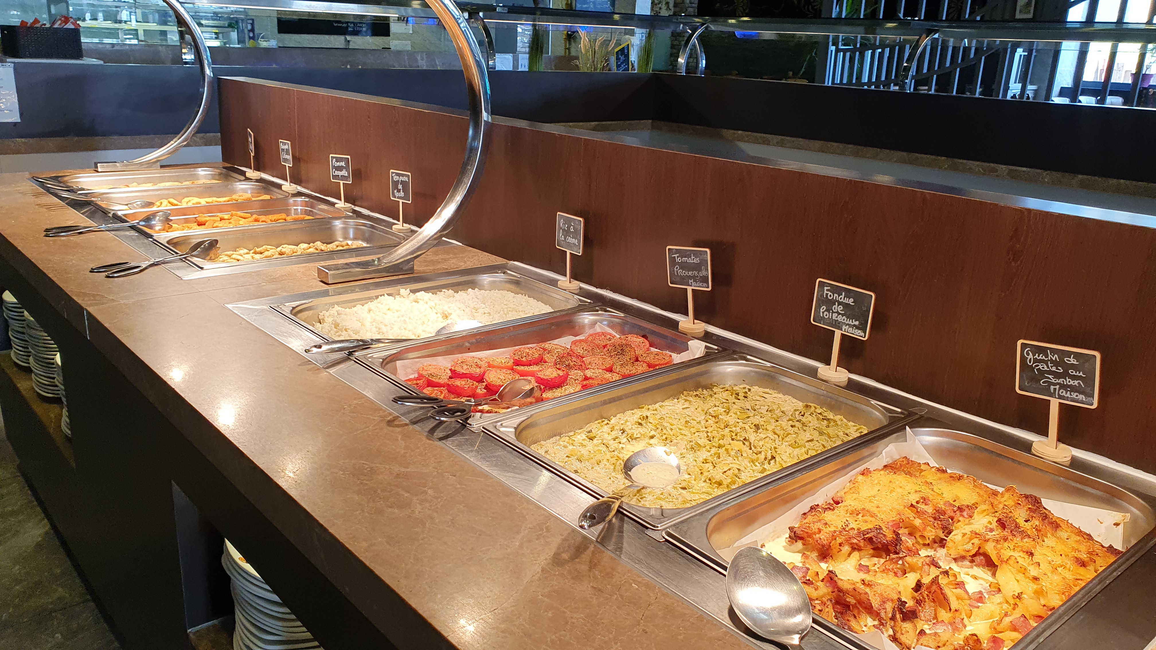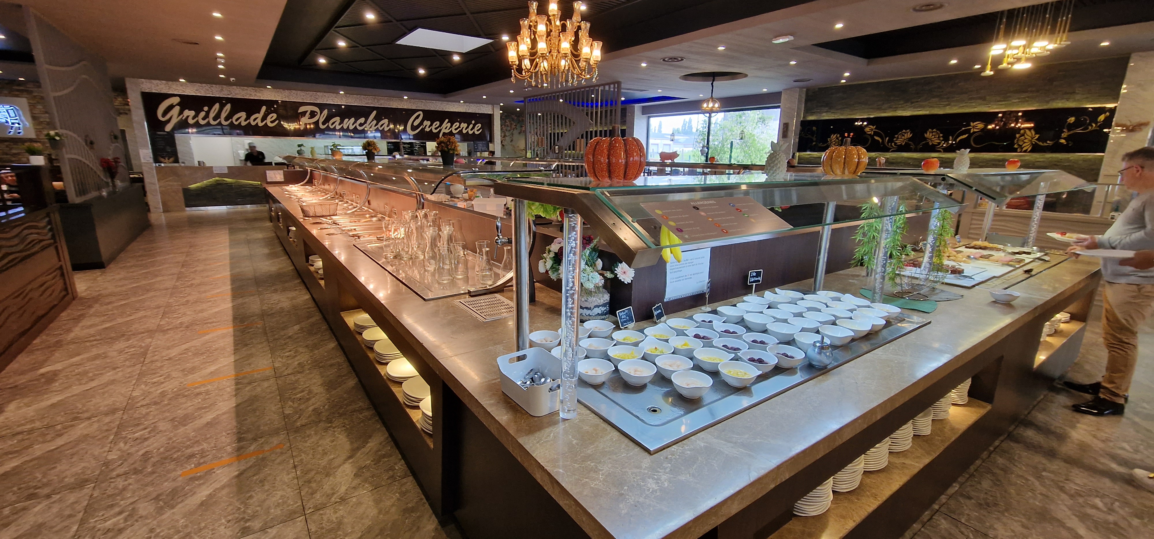 Restaurant et personnel très agréables .il y a beaucoup de choix. Cuisine traditionnelle et quelques chinoiseries des grillades de viandes aussi. Fromages et desserts variés. Fraîcheur et propreté partout. N'oubliez pas le pass sanitaire et le masque on vous fournit à l'entrée un gant pour les cuillères pour vous servir.