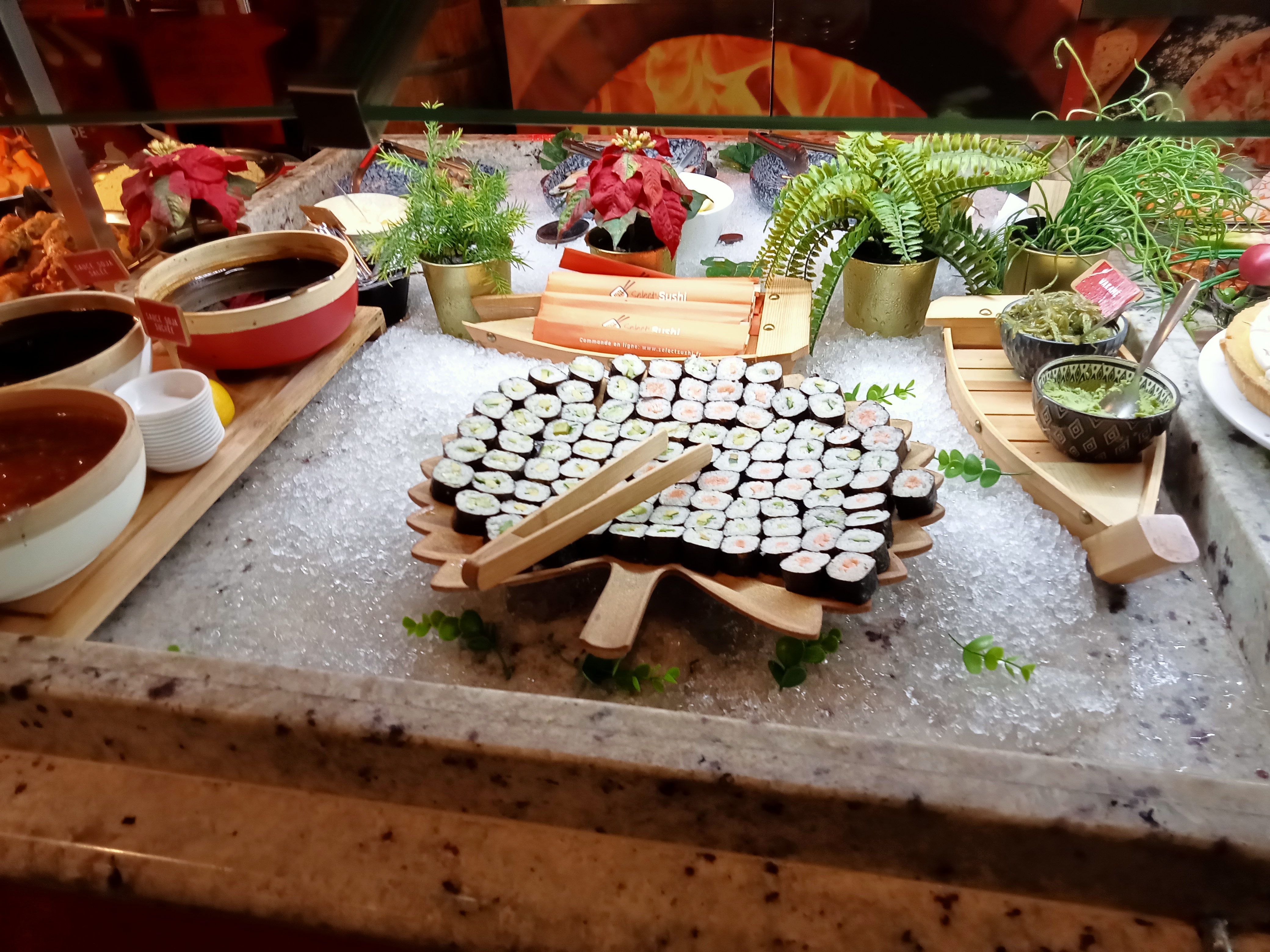Personnel super , parfois oublié des choses qu'on leur demande mais bon sa arrive avec la charge de travail donc c'est pas grave en soit . Pour ce qui est du cadre sa donne envie . Après cela j'ai commencé à manger un sushi mais j'ai l'impression qu'il sortait du congel tellement il était dur ,je prends un oeuf par la suite la même chose . La moussaka était correct ,les moules mari ieres bien minuscules. Bref vraiment déçu pour une première et malheureusement dernière . Le restaurant chinois a volonté est bien meilleur pour le coup (rien a voir ).