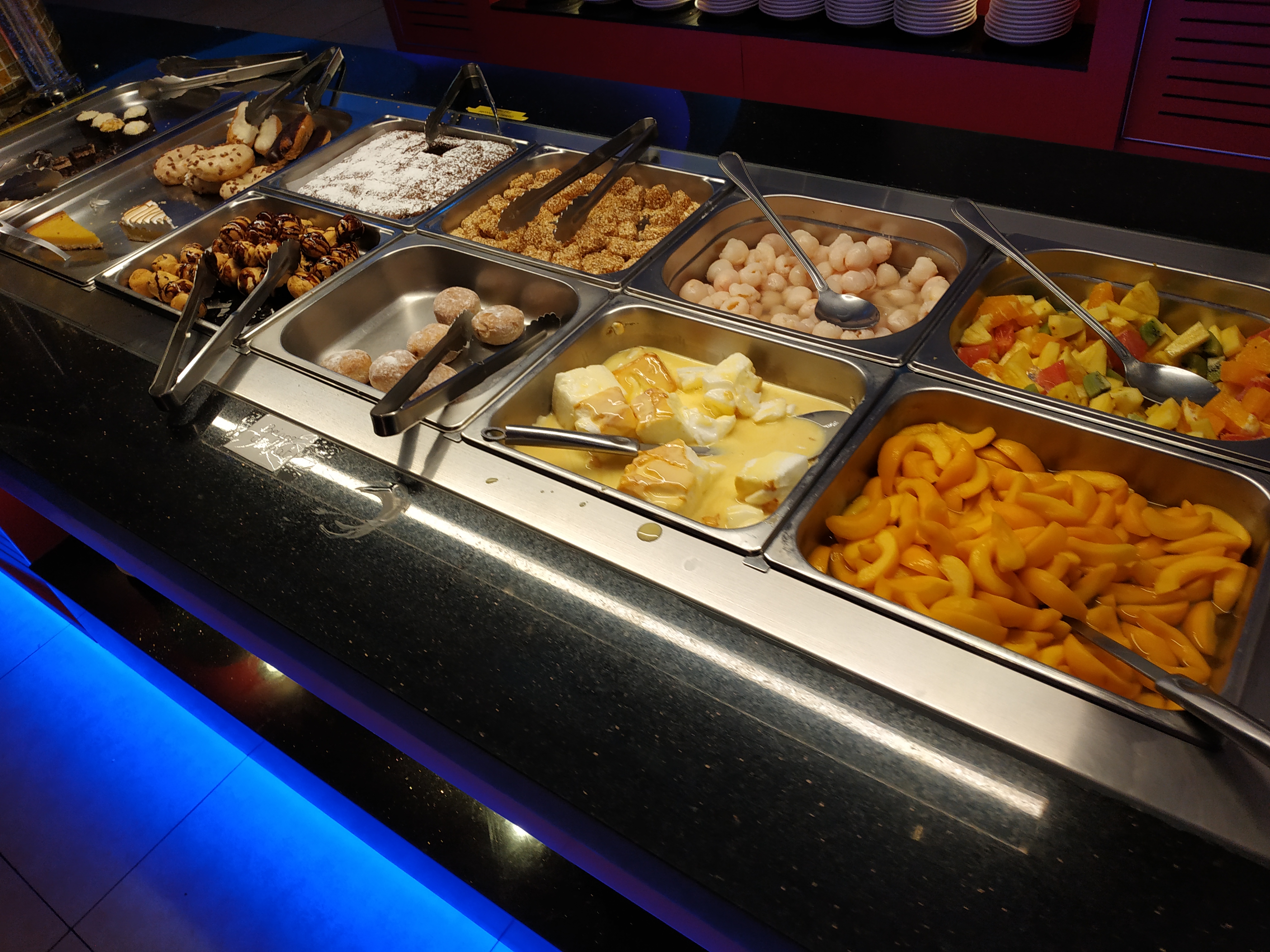 Pas de fontaine au chocolat pas de renouvellement des plats et sushis les brochette de bœuf au fromage était tellement foncée que j’ai même pas osé en toucher pas de choix sous prétexte qu’il n’y a pas beaucoup de monde et les plats dates trop secs et fade