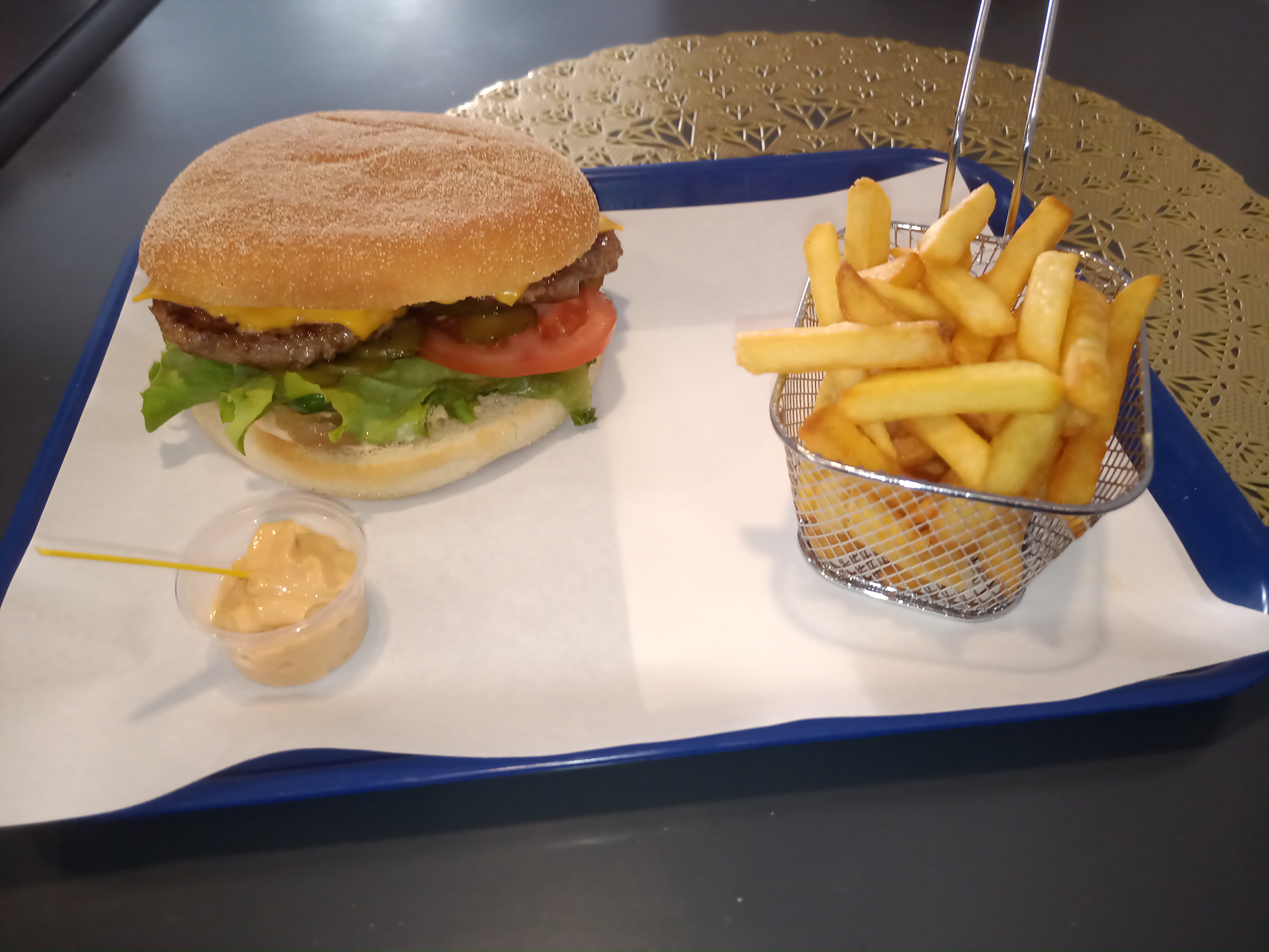 Une première pour moi dans ce restaurant. Service du midi sur place, un menu cheeseburger, frites et boisson. Nickel, cheese bien monté, chaud, le pain moelleux et légèrement toasté. La portion de frites impeccable, chaude 👍 Et pour accompagner, un petit pot de mayonnaise, le tout pour 7€50, c'est correct. Je recommande 👍