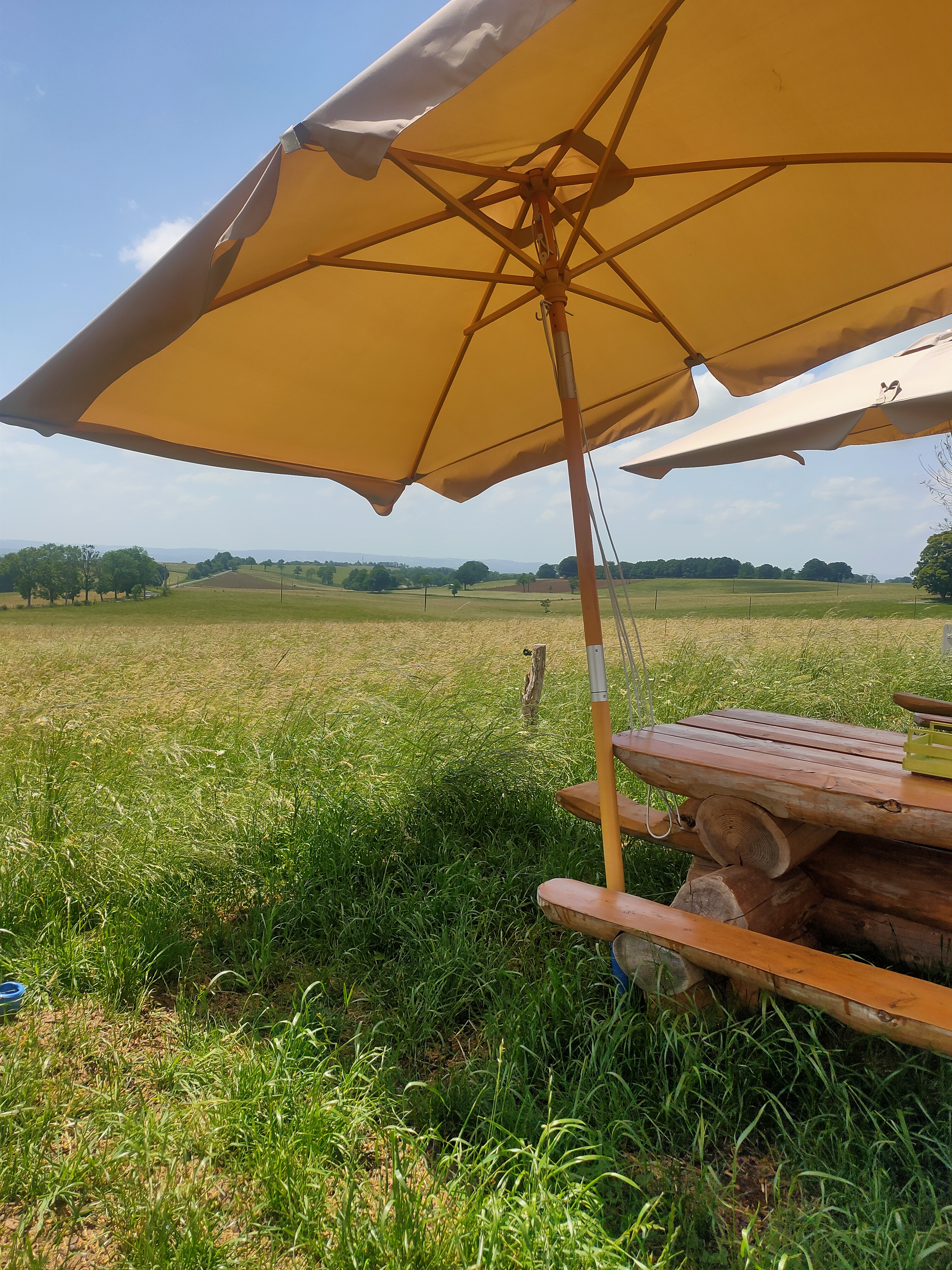 Un accueil chaleureux par les propriétaires dex lieux, qui reouvrent tranquillement la structure pour la saison estivale. Les produits proposés sont locaux pour les boissons (limonade et bières de la brasserie 360° par exemple ou glace de la ferme lune de miel) et la viande proposée provient de leur propre exploitation de vache de race Salers. Un concept original où l'on nous apporte la pièce de bœuf sur une plaque chauffée au four à bois et sur laquelle nous choisissons nous même notre cuisson mais également nos assaisonnements, relativement nombreux (pas loin d'une dizaine de poivres et sels originaux pour tous les goûts). Le produit brut étant de qualité même nature la viande est excellente. En proposition sucrée nous avons pris les cornets de Murat qui sont des biscuits en forme de cône fourrés avec de la crème fraîche montée (provenant de leur production laitière) avec des fruits frais, ici, des fraises. Une petite pépite au milieu des champs où nous reviendrons sans hésiter.
