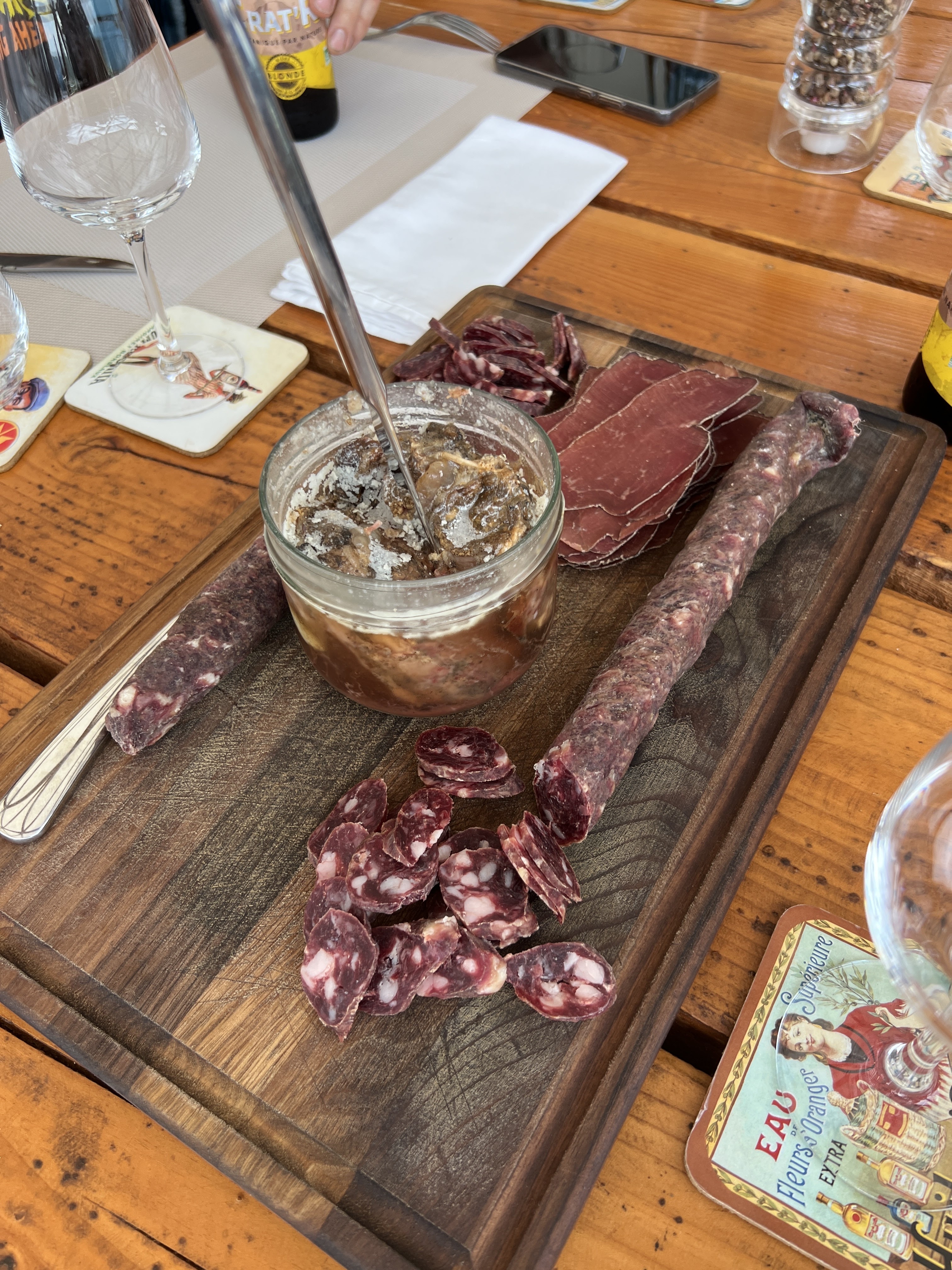 Super expérience. Personnel très agréable, saucisse, pièces de viande délicieuses, variété de sels pour l’assaisonnement. Très bon vins. Desserts surprenants. Cadre bucolique. Je recommande ! Hors du commun.