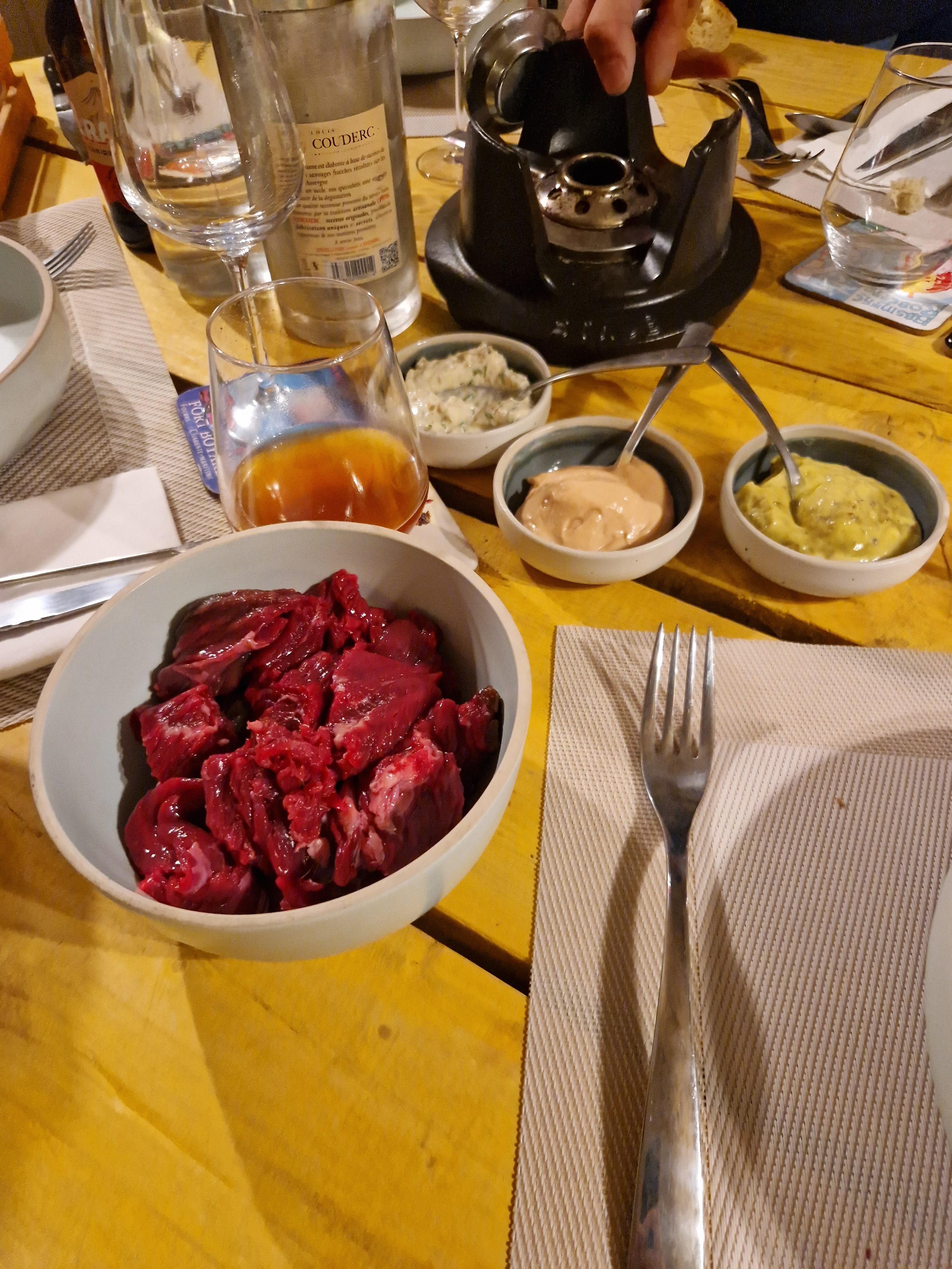 Le maître des lieux très avenant a une démarche pédagogue autour de l’élevage et la boucherie de la race Salers de sa ferme. Chacun cuit son bout de viande sur la plaque chaude au milieu de la table, fait sa découpe, gère sa cuisson,… et son assaisonnement avec plusieurs sels à disposition. Deux accompagnement possible au choix, tous deux finement cuisinés. De bons desserts locaux. Et des vins adaptés. Une expérience gastronomique unique dans un cadre original et bucolique. Inoubliable !