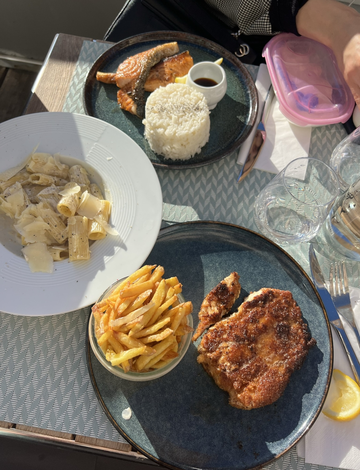 Nous sommes venus ici pour manger un morceau rapidement ; il n'y avait pas beaucoup d'endroits ouverts à cette époque pour manger. Force est de constater que le lieu n’est plus neuf, j’ai aimé les chaises, elles étaient très confortables. Les tables sont très proches les unes des autres, ce qui n'est pas très pratique. Il y avait beaucoup de monde à notre arrivée et il n'y avait qu'un seul serveur, mais il gérait tout. J'ai beaucoup aimé le service, il était très sympathique et nous a parlé des plats du jour. J'ai pris des légumes et des escalopes de poulet, des frites en accompagnement, ainsi qu'une salade César. Le César avait beaucoup de sauce, ce qui est un inconvénient. Les légumes étaient très savoureux, avaient un goût de beurre, mais très gras😅 comme le schnitzel. Les pommes de terre étaient tellement bonnes. Il n'y avait pas de sauce. Convient uniquement si vous prenez simplement une collation rapide.