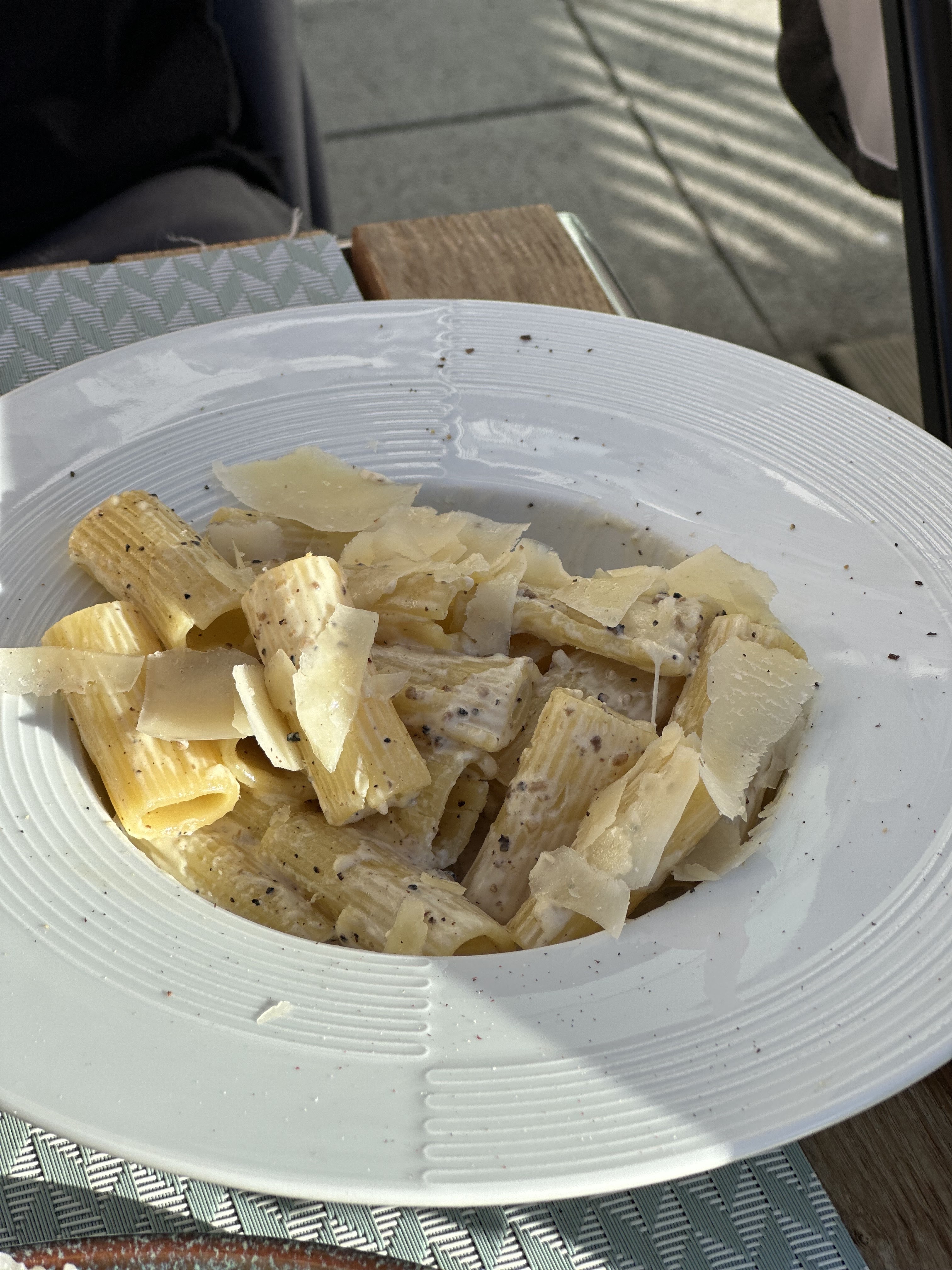 J'ai eu leurs Rigatoni à la crème et à la truffe. C'était excellent! Je dirais que la nourriture vaut vraiment son prix, étant donné que le restaurant est situé au centre de Nice. Les gens y sont gentils et l'ambiance est calme et paisible. Je pense que jouer de la musique le rendra meilleur !
