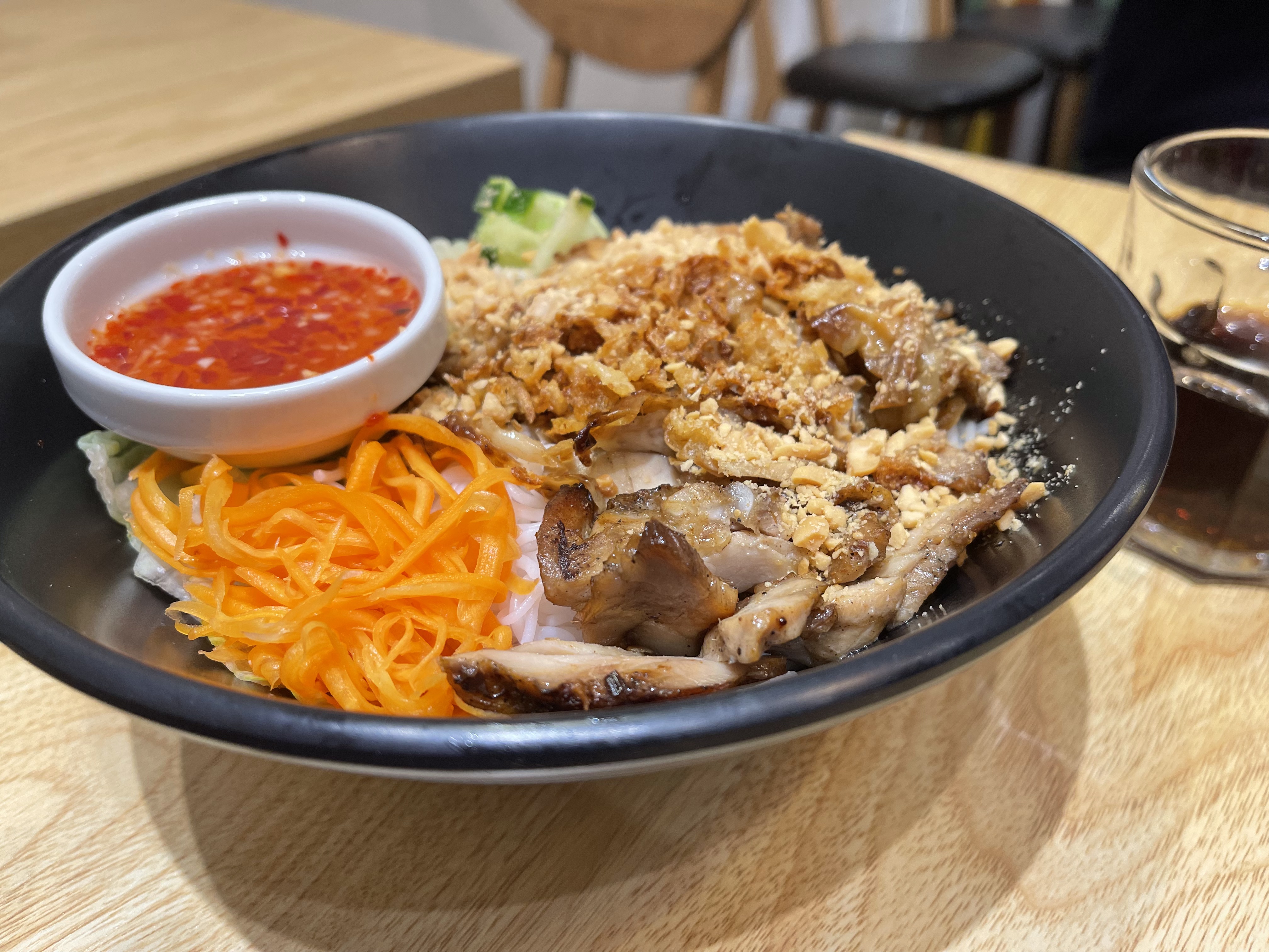 Merveilleuse découverte! J'ai pris un bobun au boeuf et il était parfait. Parfumé juste comme il fallait. Un vrai voyage pour les sens, je recommande fortement! Ils font aussi des sandwiches et il me semble qu'il y a des plats vegans aussi. Vous pouvez y aller sans hésitation!