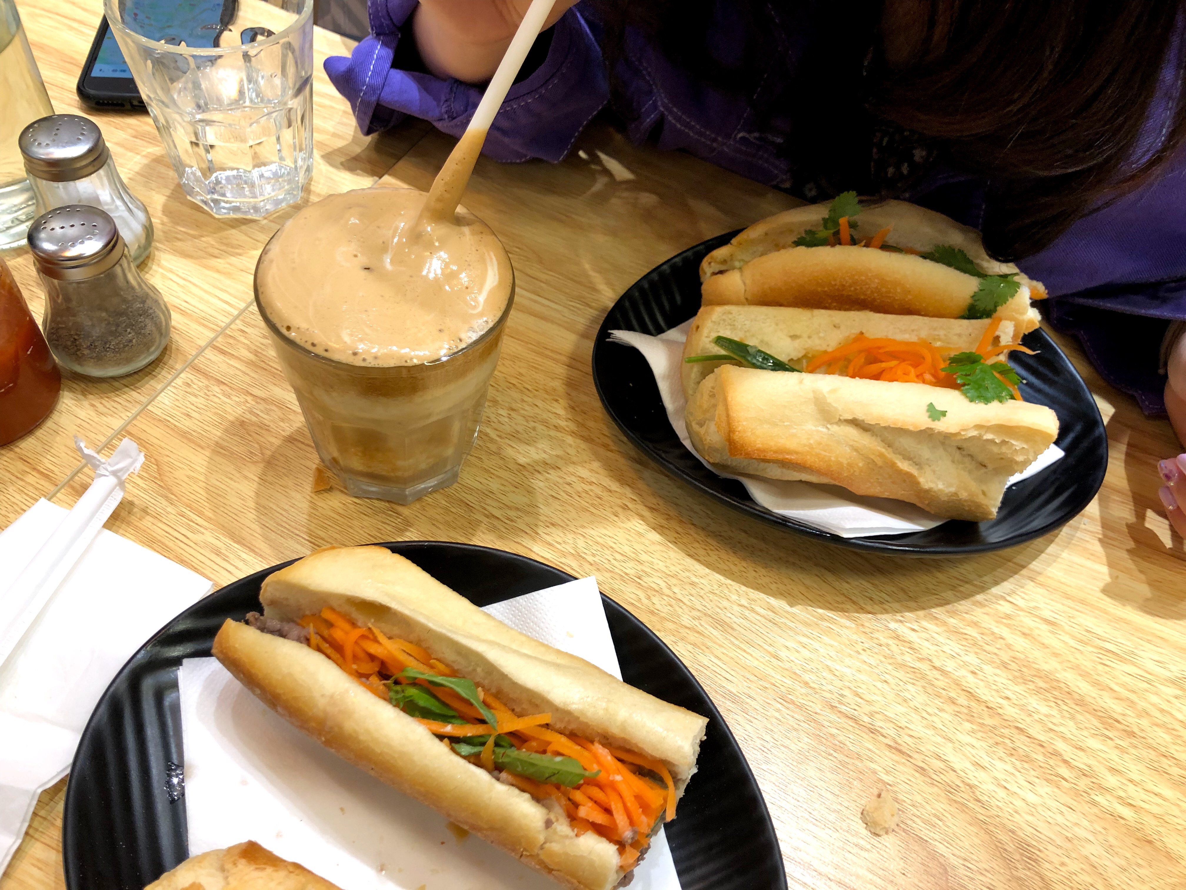 Je suis venu tard dans la nuit et ils ont répondu gentiment. J'avais du banh mi, mais le pain était un peu dur et bien sûr il y avait de la coriandre. Si vous ne l'aimez pas, demandez sa suppression. Il y en avait beaucoup, alors je leur ai demandé d'emballer les restes. Le Frappuccino à la noix de coco avait un goût très similaire au smoothie à la noix de coco que j'avais au Kong Cafe au Vietnam. Bien sûr, il y a le wifi gratuit
