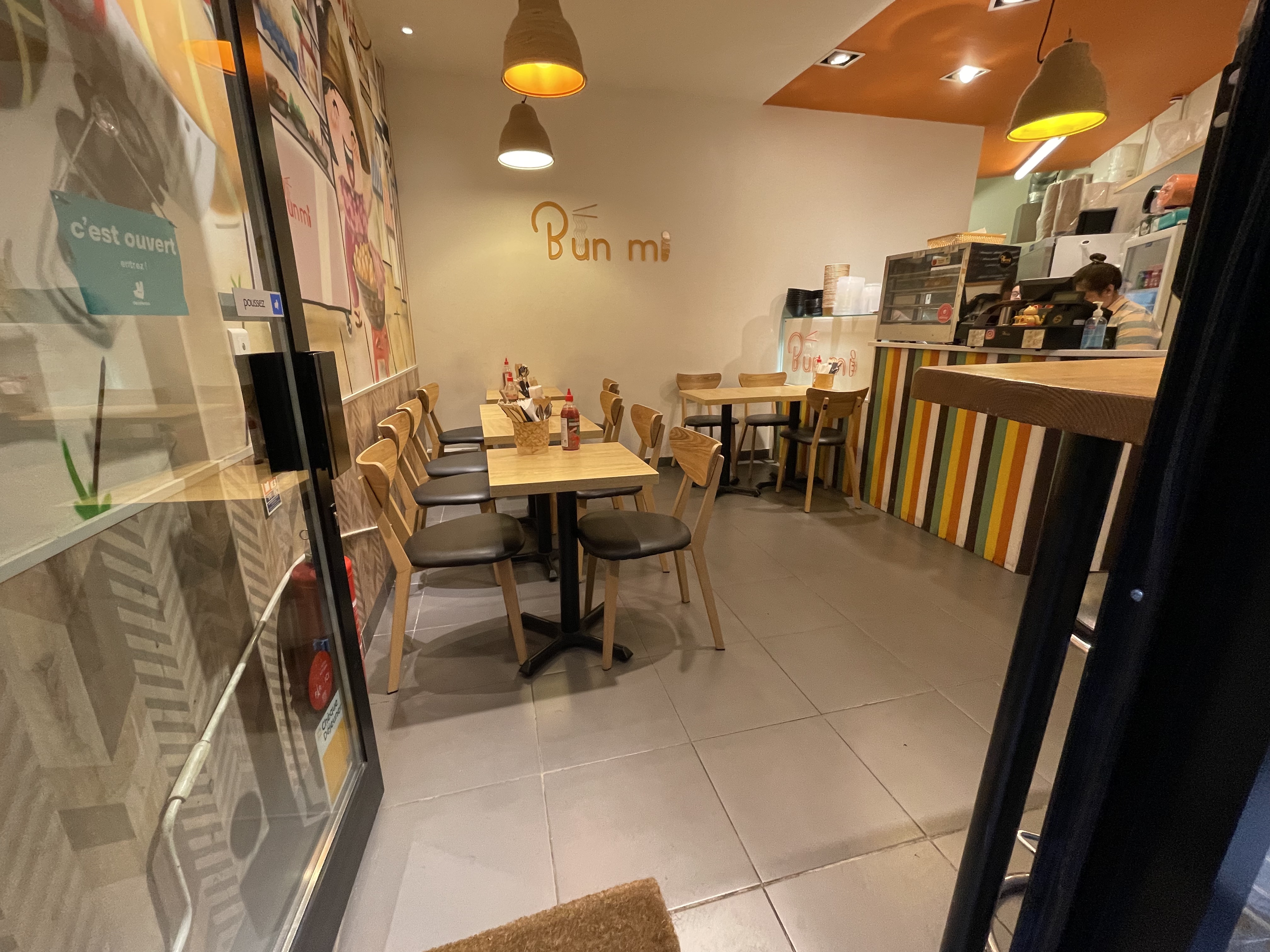 Bon emplacement ! Bons plats vietnamiens : le bo bun a un goût original et peut être considéré comme un aliment sain et non copieux, il est donc bon pour le déjeuner !! Le prix est bien pour cette portion. Le sandwich est différent de l'original vietnamien. Cependant, comparé aux autres sandwichs vietnamiens de Paris, celui-ci est l’un des meilleurs que j’ai jamais testé et il est super bon si on le déguste lorsqu’il fait chaud. Boissons, vous devriez absolument essayer la boisson maison « pêche 🍑 thé glacé » Thé glacé à la pêche. C'est super duper bon.