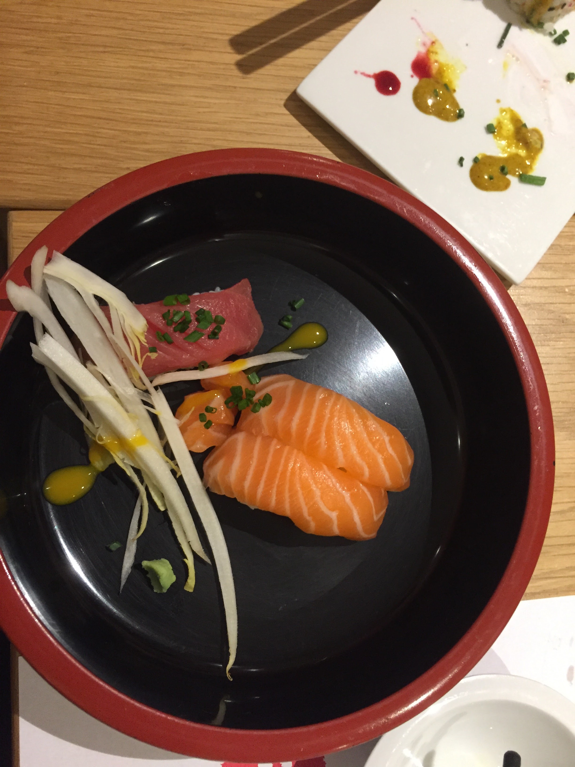 Le cadre est magnifique, les assiettes sont superbes, et l'addition aussi. Par contre, une arête dans le sushi à la daurade, daurade qui était de toute façon ferme et caoutchouteuse, le thon est dur et quasi croustillant. Le saumon est bon. Voilà. Super. Les makis pleins de coriandre sont écœurants, le chirashi est un bol de riz avec des lamelles de poisson si fines qu'on voit au travers. En fait, pour un prix exorbitant j'ai mangé du riz au vinaigre. Hourra !