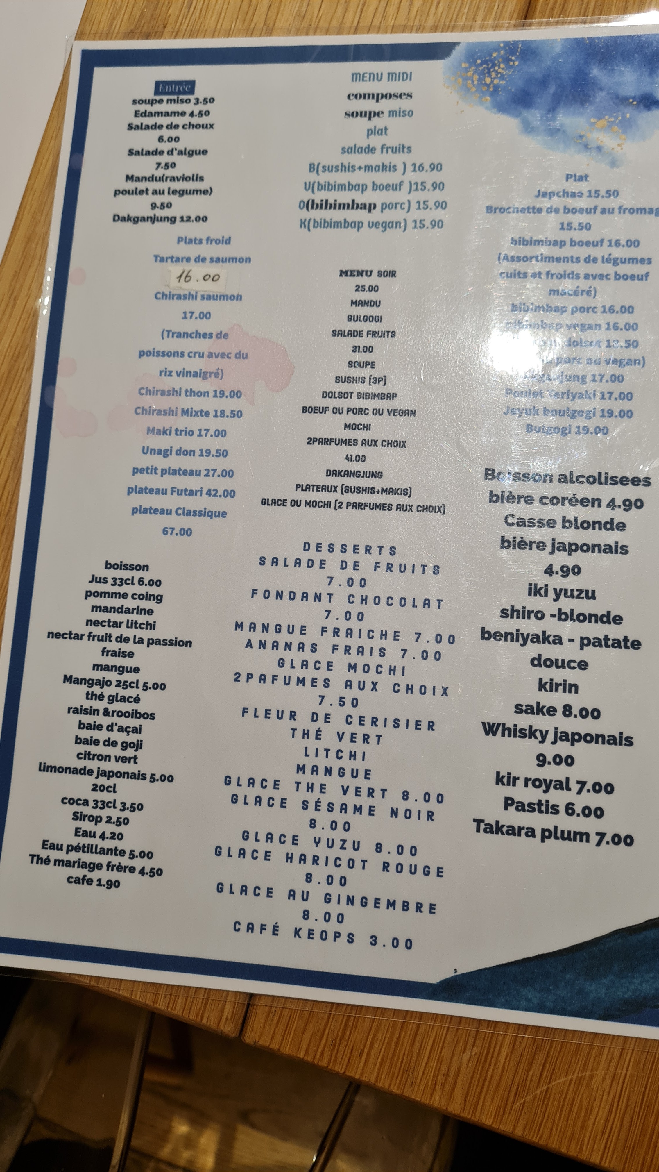 Bonjour Je suis venue quelques fois : mais entre le trop tôt pour les sushis et le trop tard ou attente pour le service et les sushis... On a l'impression que le client n'est pas au centre de leurs intérêts...mais plutôt une facilité de service et finir tôt et pas trop de complication en cuisine... Autant ne proposer qu'une carte avec 2 plats 🥴! Aussi, un soir, venue avec une amie et sur le menu à plus de 30€ : - soupe sans tofu, ni champignon, - attendre 20h pour avoir 3 mini sushi au saumon - le plat excellent, heureusement (mais pas assez relevé pour mon amie) - le dessert ; un mochi glacé coupé...on a l'impression d'avoir un demi mochi...3 mini petits bouts... - presque aucun choix de tisane ou thé... Mon amie était une cliente réguliere plutôt le midi ; la qualité a nettement baissé (et pas les prix). Et franchement, moi, pour être venu qq fois, les soirs... Je n'y reviendrai plus... Avis donné en allant payer ; préfère un avis google et écoute/ retour client très moyen...